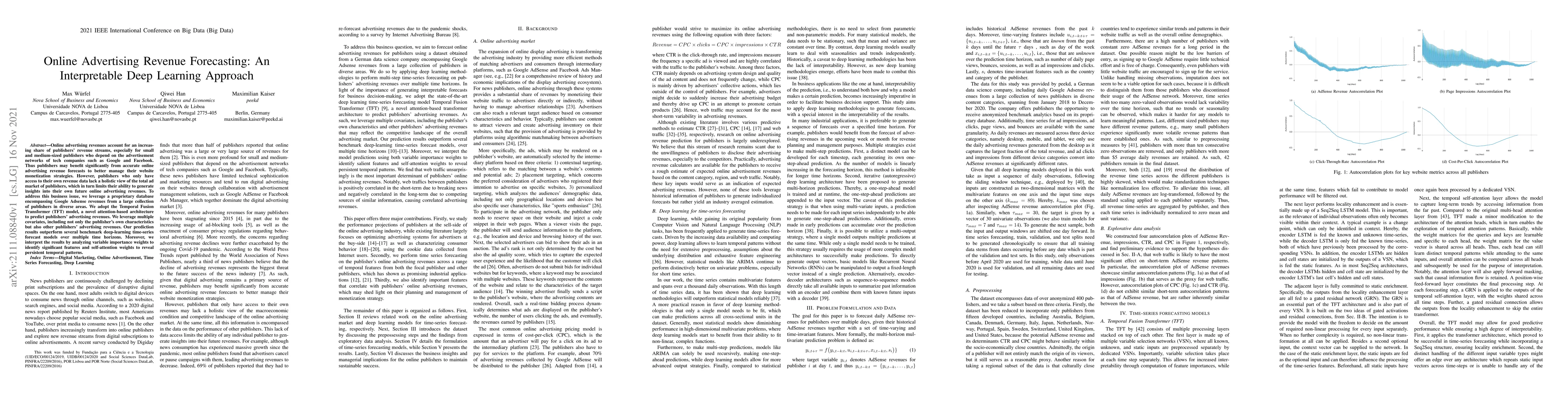 This paper proposes an interpretable deep learning approach using Temporal Fusion Transformers to forecast online advertising revenues for publishers. The model leverages a proprietary database with Google Adsense data, incorporating both individual publisher and cross-publisher covariates, leading to superior forecasting performance compared to other deep-learning models.