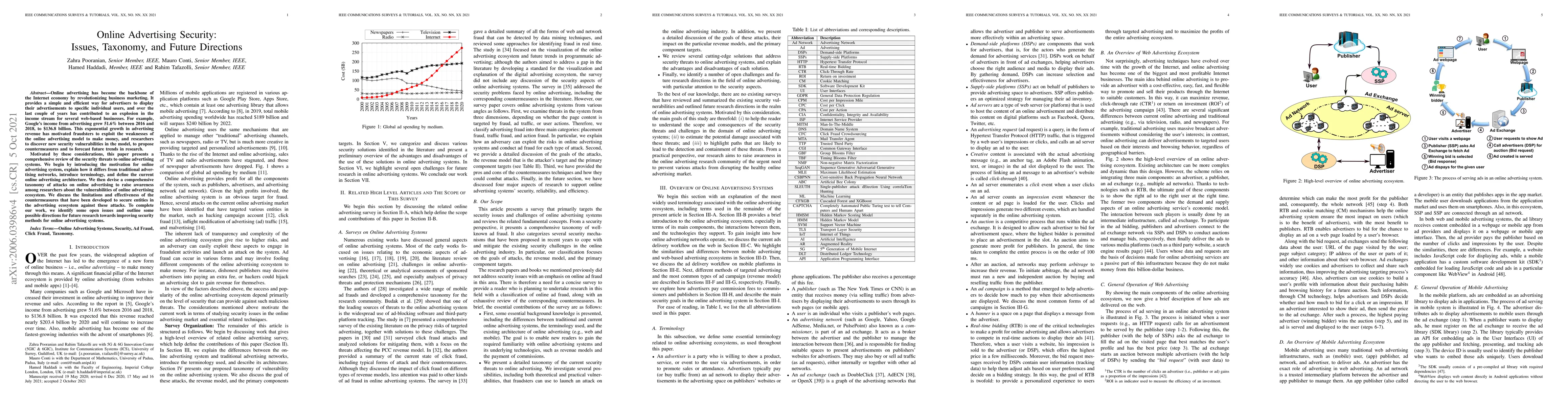 This paper reviews security threats to online advertising systems, detailing the unique vulnerabilities of the online model compared to traditional advertising. It proposes a taxonomy of attacks and discusses existing countermeasures, while also identifying open issues and suggesting future research directions to enhance security.