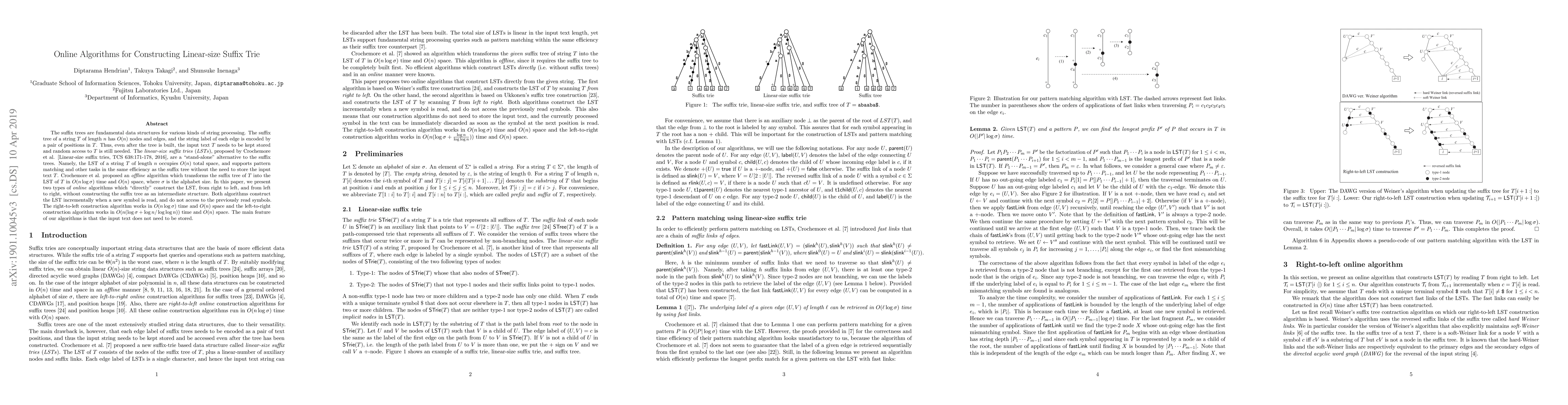 The suffix trees are fundamental data structures for various kinds of string processing. The suffix tree of a string $T$ of length $n$ has $O(n)$ nodes and edges, and the string label of each edge is encoded by a pair of positions in $T$. Thus, even after the tree is built, the input text $T$ needs to be kept stored and random access to $T$ is still needed. The linear-size suffix tries (LSTs), proposed by Crochemore et al. [Linear-size suffix tries, TCS 638:171-178, 2016], are a `stand-alone' alternative to the suffix trees. Namely, the LST of a string $T$ of length $n$ occupies $O(n)$ total space, and supports pattern matching and other tasks in the same efficiency as the suffix tree without the need to store the input text $T$. Crochemore et al. proposed an offline algorithm which transforms the suffix tree of $T$ into the LST of $T$ in $O(n \log \sigma)$ time and $O(n)$ space, where $\sigma$ is the alphabet size. In this paper, we present two types of online algorithms which `directly' construct the LST, from right to left, and from left to right, without constructing the suffix tree as an intermediate structure. Both algorithms construct the LST incrementally when a new symbol is read, and do not access to the previously read symbols. The right-to-left construction algorithm works in $O(n \log \sigma)$ time and $O(n)$ space and the left-to-right construction algorithm works in $O(n (\log \sigma + \log n / \log \log n))$ time and $O(n)$ space. The main feature of our algorithms is that the input text does not need to be stored.