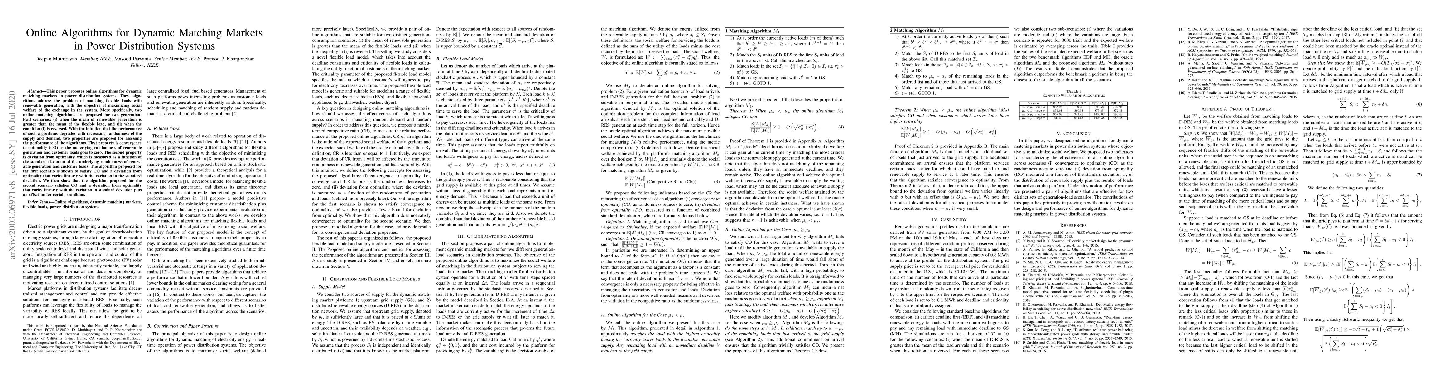 This paper proposes online algorithms for dynamic matching markets in power distribution systems, which at any real-time operation instance decides about matching -- or delaying the supply of -- flexible loads with available renewable generation with the objective of maximizing the social welfare of the exchange in the system. More specifically, two online matching algorithms are proposed for the following generation-load scenarios: (i) when the mean of renewable generation is greater than the mean of the flexible load, and (ii) when the condition (i) is reversed. With the intuition that the performance of such algorithms degrades with increasing randomness of the supply and demand, two properties are proposed for assessing the performance of the algorithms. First property is convergence to optimality (CO) as the underlying randomness of renewable generation and customer loads goes to zero. The second property is deviation from optimality, is measured as a function of the standard deviation of the underlying randomness of renewable generation and customer loads. The algorithm proposed for the first scenario is shown to satisfy CO and a deviation from optimal that varies linearly with the variation in the standard deviation. But the same algorithm is shown to not satisfy CO for the second scenario. We then show that the algorithm proposed for the second scenario satisfies CO and a deviation from optimal that varies linearly with the variation in standard deviation plus an offset.