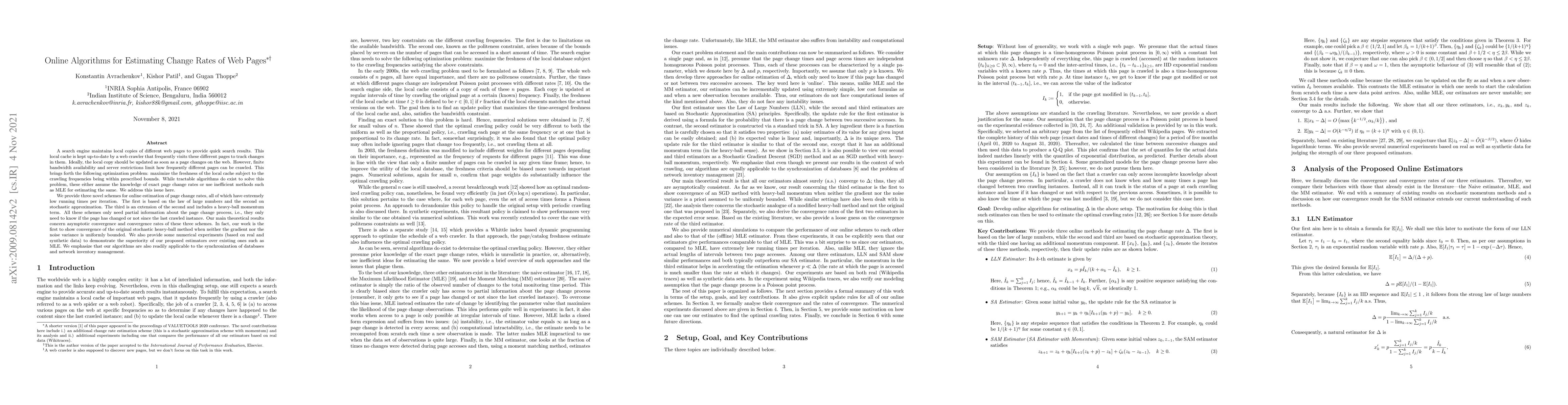This paper proposes three novel online algorithms for estimating the change rates of web pages, addressing the challenge of updating local caches efficiently under bandwidth constraints. The schemes are based on the law of large numbers, stochastic approximation, and an extended heavy-ball method, all demonstrating low computational costs and asymptotic convergence. The proposed methods outperform existing estimators like MLE, as shown through theoretical analysis and numerical experiments.