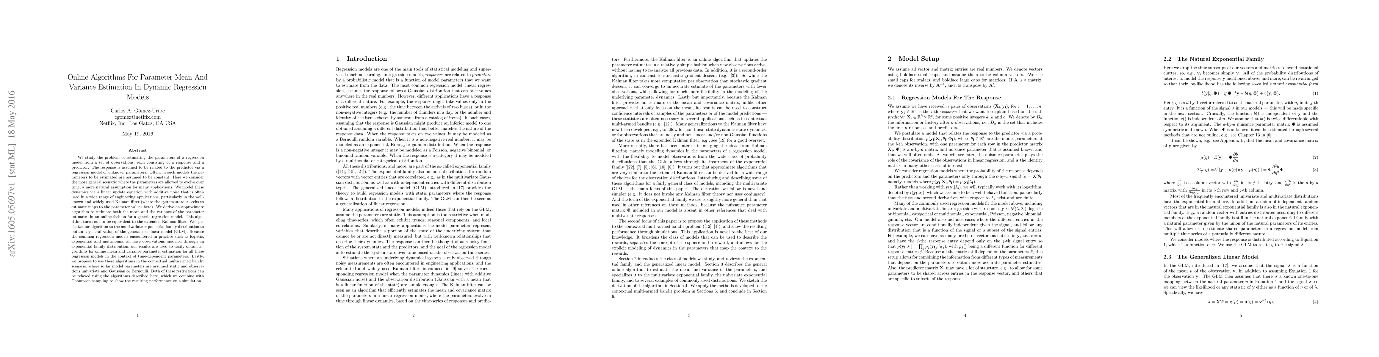 This paper proposes an online algorithm for estimating the mean and variance of time-varying parameters in dynamic regression models, equivalent to the extended Kalman filter. It extends the approach to multivariate exponential family distributions, enabling its application to generalized linear models, and demonstrates its utility in the contextual multi-armed bandit problem.