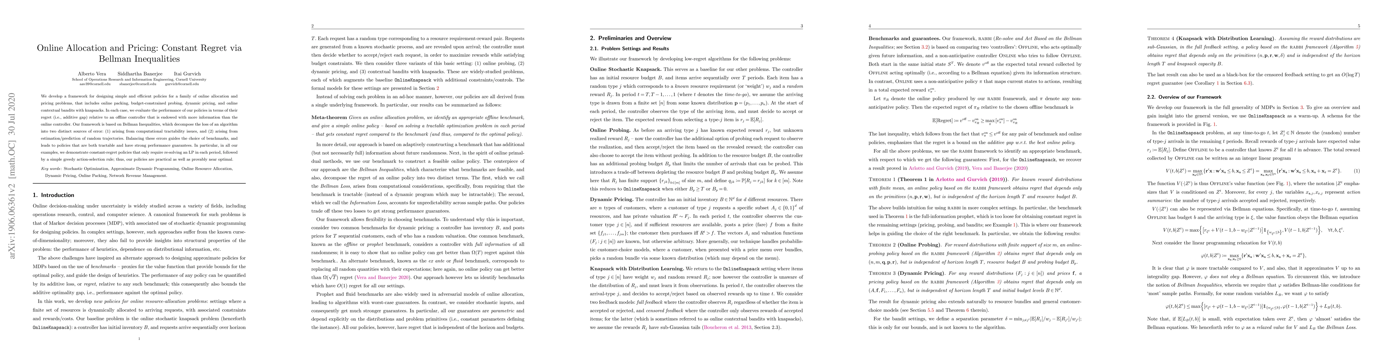 Researchers develop a framework for designing efficient online policies using Bellman Inequalities, achieving constant regret in various allocation and pricing problems.