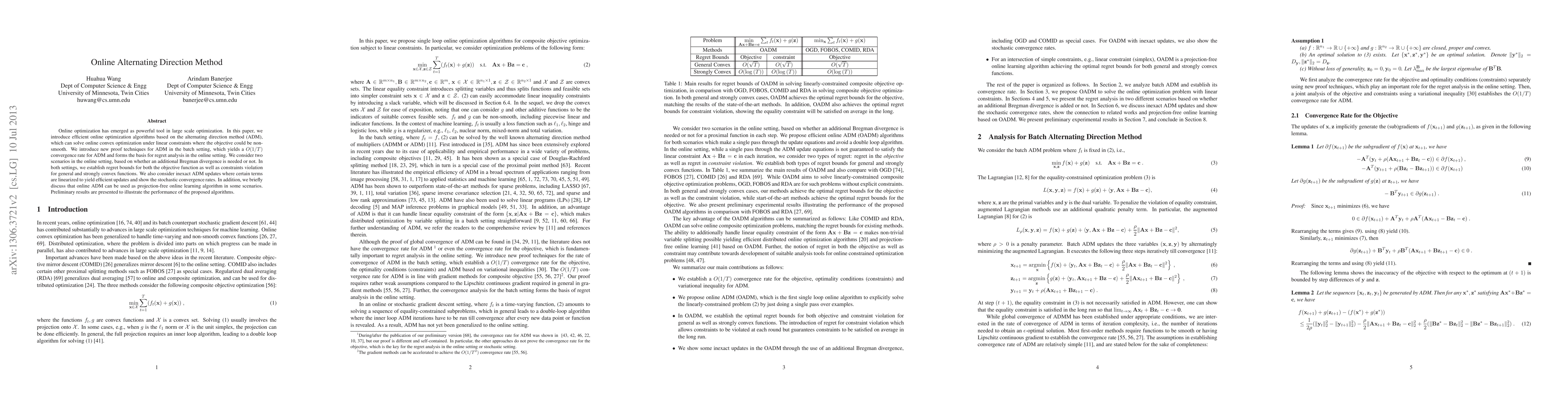 Online optimization has emerged as powerful tool in large scale optimization. In this pa- per, we introduce efficient online optimization algorithms based on the alternating direction method (ADM), which can solve online convex optimization under linear constraints where the objective could be non-smooth. We introduce new proof techniques for ADM in the batch setting, which yields a O(1/T) convergence rate for ADM and forms the basis for regret anal- ysis in the online setting. We consider two scenarios in the online setting, based on whether an additional Bregman divergence is needed or not. In both settings, we establish regret bounds for both the objective function as well as constraints violation for general and strongly convex functions. We also consider inexact ADM updates where certain terms are linearized to yield efficient updates and show the stochastic convergence rates. In addition, we briefly discuss that online ADM can be used as projection- free online learning algorithm in some scenarios. Preliminary results are presented to illustrate the performance of the proposed algorithms.