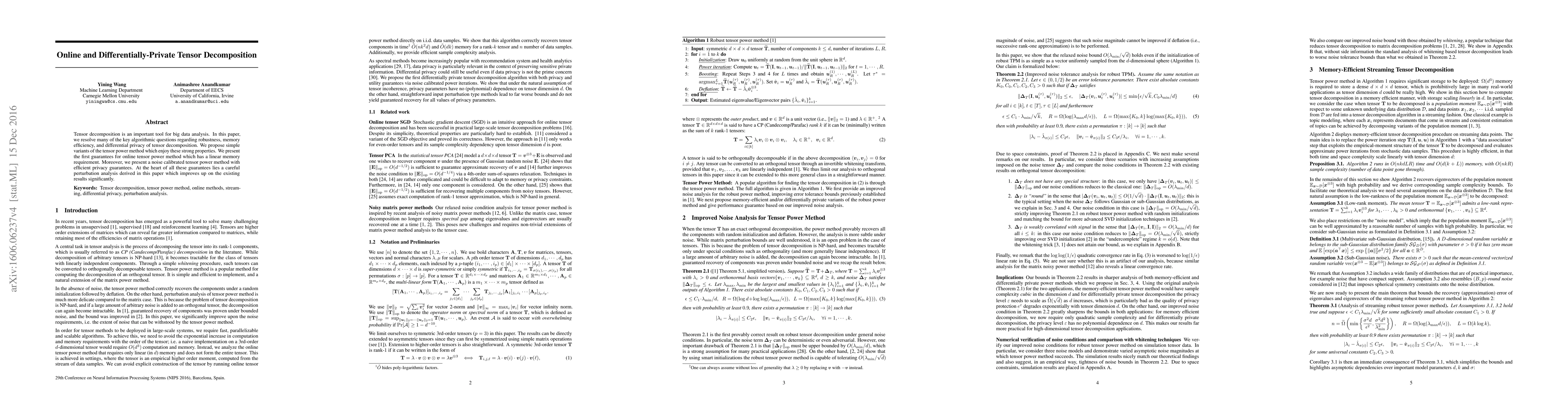 This paper proposes a new tensor decomposition method that balances robustness, memory efficiency, and differential privacy, offering strong guarantees for online and offline analysis. The work provides significant improvements over existing results through careful perturbation analysis.