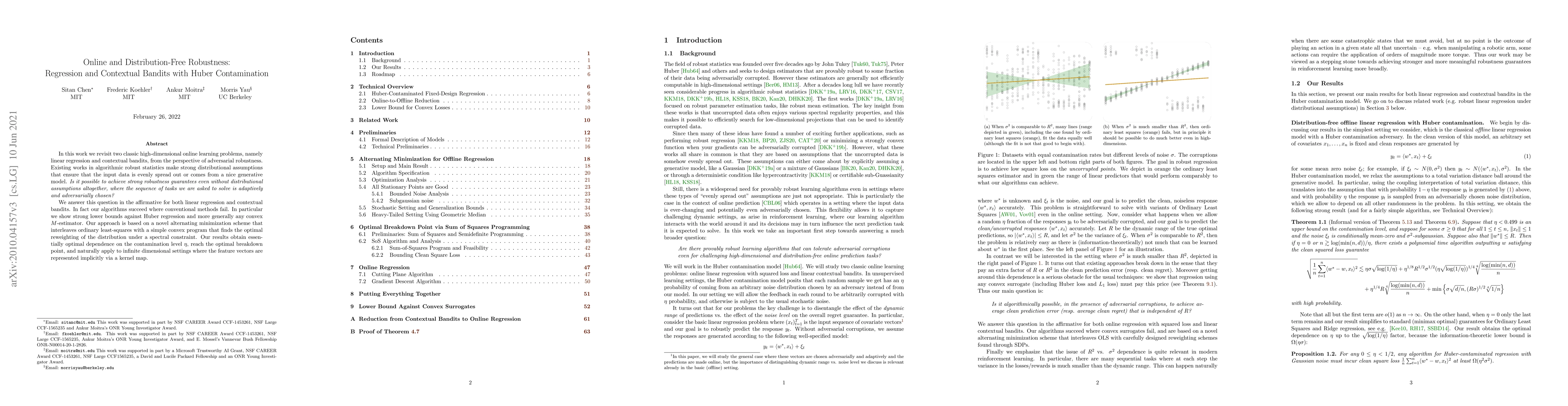 This paper addresses the robustness of linear regression and contextual bandits under adversarial contamination without distributional assumptions. It proposes a novel alternating minimization scheme that achieves optimal robustness guarantees, outperforming conventional methods.