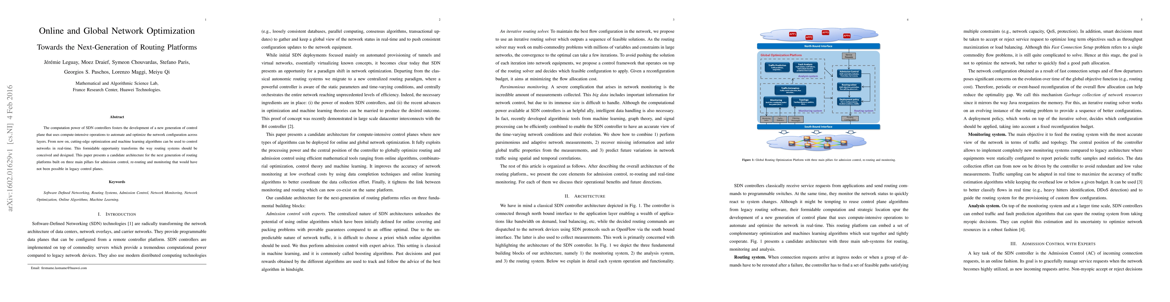 This paper proposes a next-generation routing platform leveraging SDN controllers' computational power to implement advanced optimization and machine learning for real-time network configuration. The architecture focuses on three pillars: admission control, re-routing, and monitoring, surpassing traditional control plane limitations.