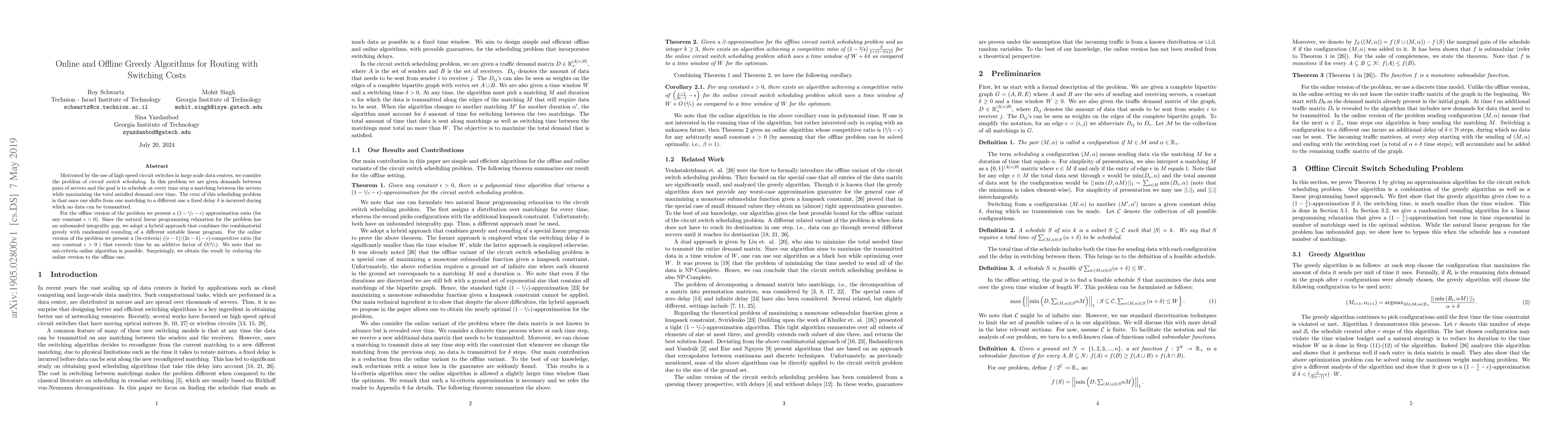 The paper presents both offline and online greedy algorithms for circuit switch scheduling, considering switching costs and delays. It uses a hybrid approach combining combinatorial greedy with randomized rounding of a suitable linear program for the offline case, and reduces the online version to the offline one for analysis.