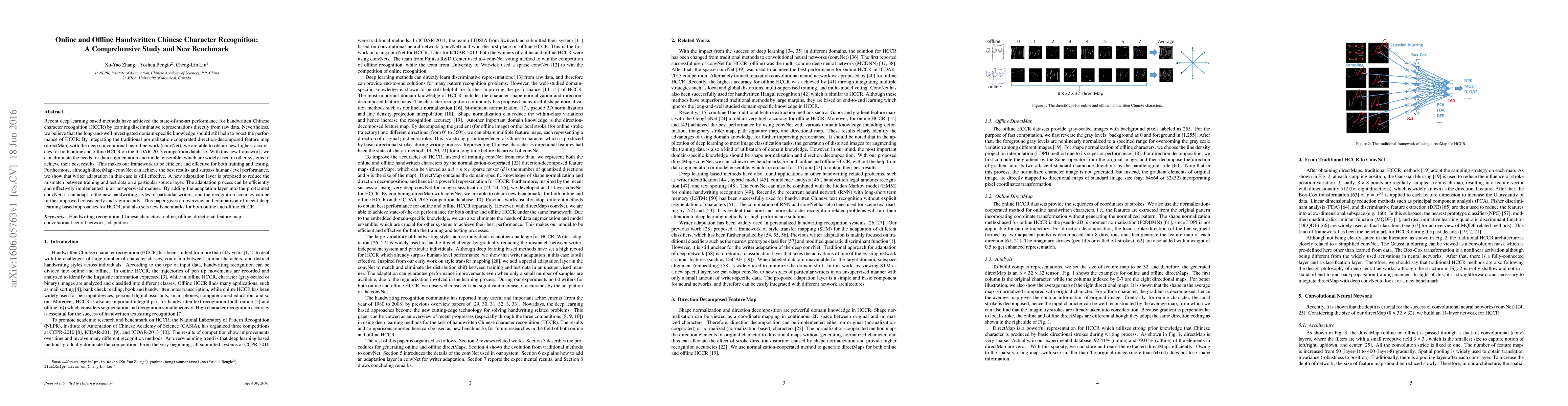 This paper proposes a hybrid approach combining directMap with a convolutional neural network (convNet) for handwritten Chinese character recognition, achieving state-of-the-art performance on the ICDAR-2013 database. It introduces an unsupervised writer adaptation layer to further improve recognition accuracy by adapting to new handwriting styles.