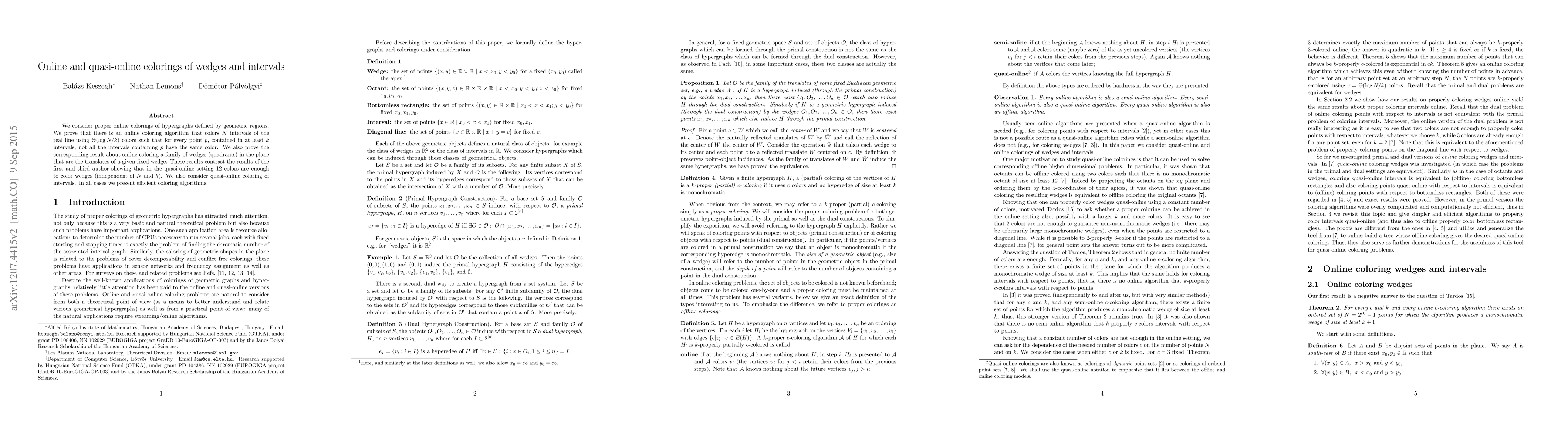 We consider proper online colorings of hypergraphs defined by geometric regions. We prove that there is an online coloring algorithm that colors $N$ intervals of the real line using $\Theta(\log N/k)$ colors such that for every point $p$, contained in at least $k$ intervals, not all the intervals containing $p$ have the same color. We also prove the corresponding result about online coloring a family of wedges (quadrants) in the plane that are the translates of a given fixed wedge. These results contrast the results of the first and third author showing that in the quasi-online setting 12 colors are enough to color wedges (independent of $N$ and $k$). We also consider quasi-online coloring of intervals. In all cases we present efficient coloring algorithms.