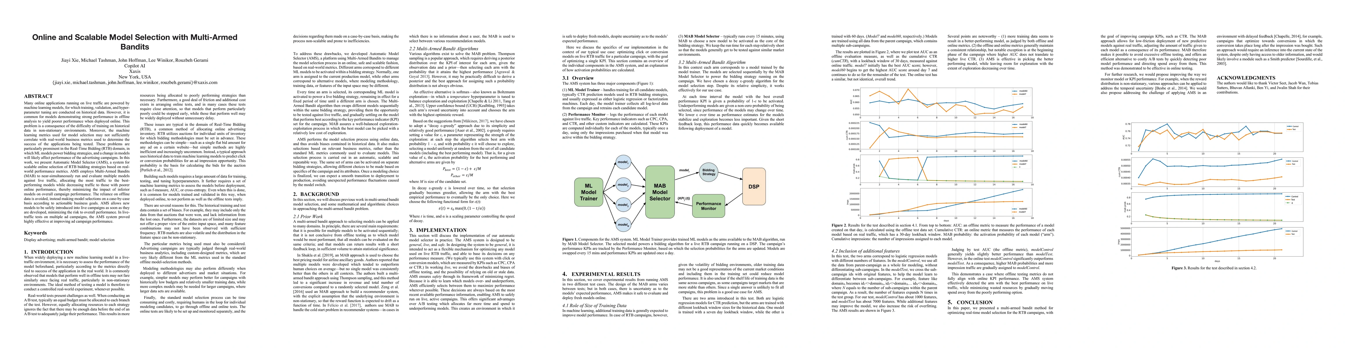 This paper introduces Automatic Model Selector (AMS), a system for online and scalable model selection in Real-Time Bidding (RTB) using Multi-Armed Bandits (MAB). AMS evaluates multiple models in real-time against live traffic, dynamically allocating traffic to the best-performing models to enhance ad campaign performance while minimizing the risk of inferior models.