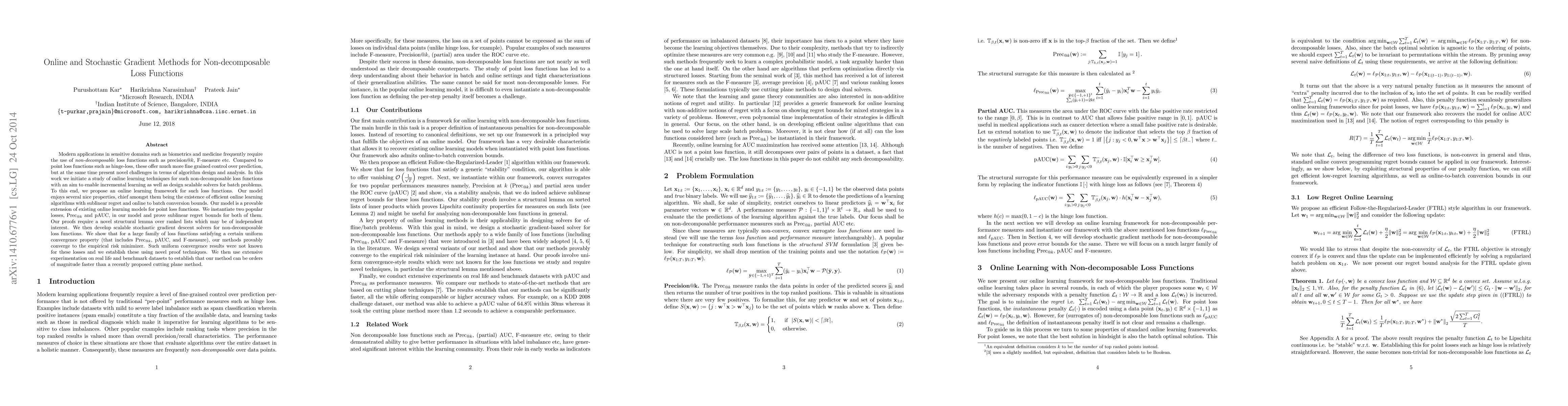 This paper proposes online learning techniques for non-decomposable loss functions, such as precision@k and pAUC, enabling incremental learning and scalable batch solvers. It introduces efficient algorithms with sublinear regret and establishes uniform convergence properties for these losses, demonstrating significant speed improvements over existing methods.