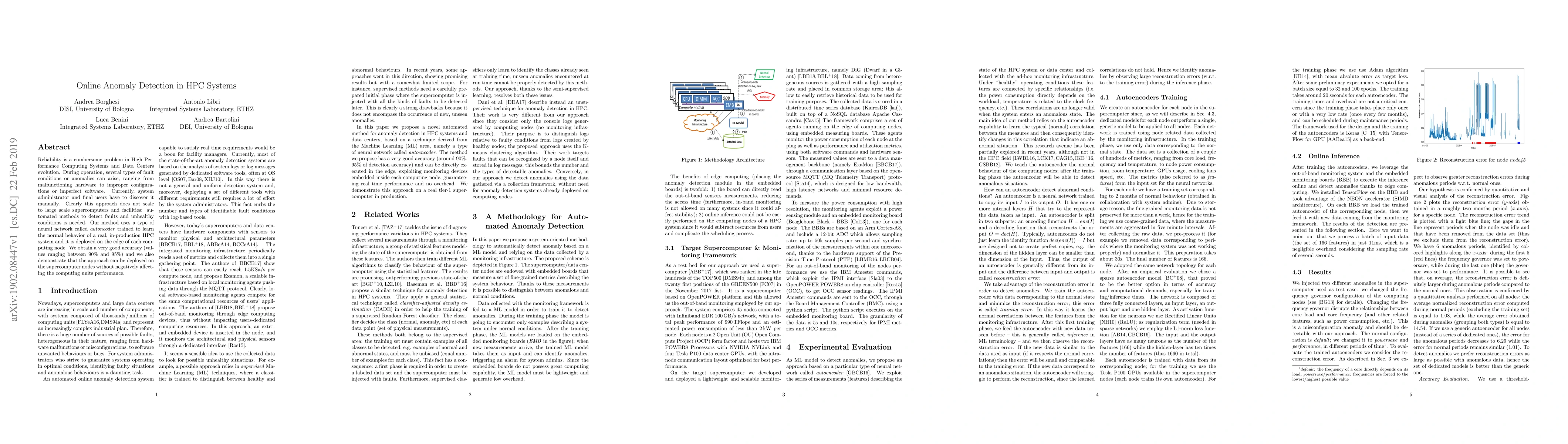 Reliability is a cumbersome problem in High Performance Computing Systems and Data Centers evolution. During operation, several types of fault conditions or anomalies can arise, ranging from malfunctioning hardware to improper configurations or imperfect software. Currently, system administrator and final users have to discover it manually. Clearly this approach does not scale to large scale supercomputers and facilities: automated methods to detect faults and unhealthy conditions is needed. Our method uses a type of neural network called autoncoder trained to learn the normal behavior of a real, in-production HPC system and it is deployed on the edge of each computing node. We obtain a very good accuracy (values ranging between 90% and 95%) and we also demonstrate that the approach can be deployed on the supercomputer nodes without negatively affecting the computing units performance.