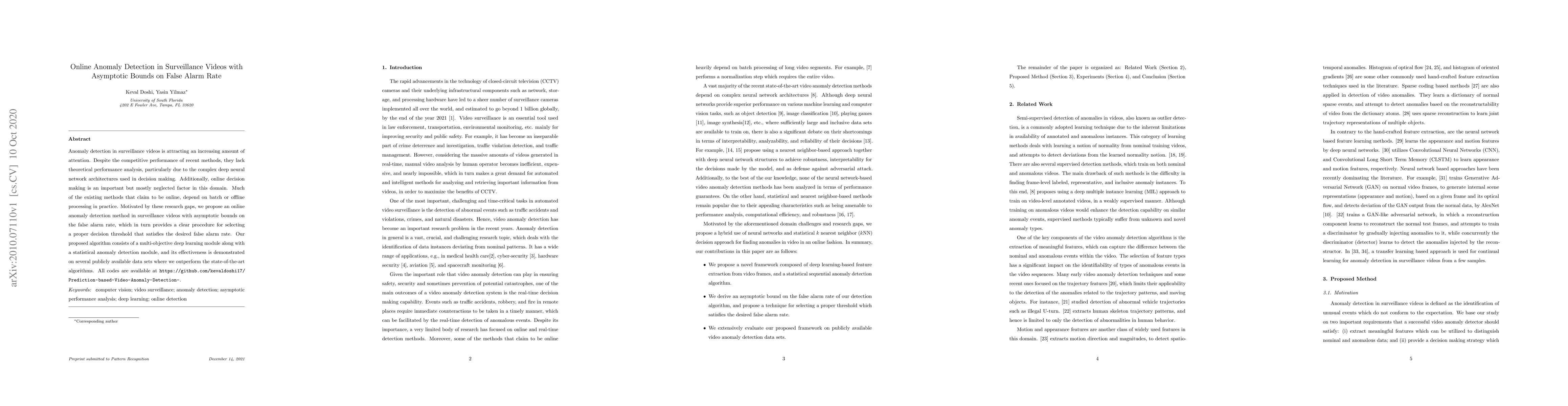 This paper proposes an online anomaly detection method for surveillance videos that provides theoretical performance analysis with asymptotic bounds on the false alarm rate. It combines a multi-objective deep learning module with a statistical anomaly detection module, achieving superior performance on public datasets compared to state-of-the-art algorithms.