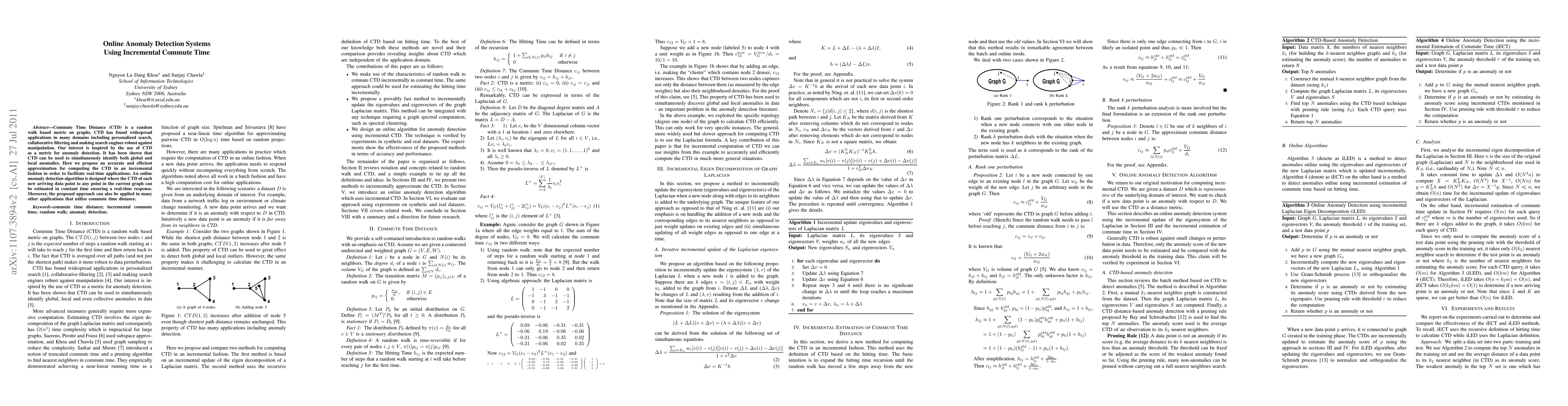 This paper proposes an efficient algorithm to detect anomalies in real-time using Commute Time Distance (CTD) on graphs, enabling constant-time computation for new data points.