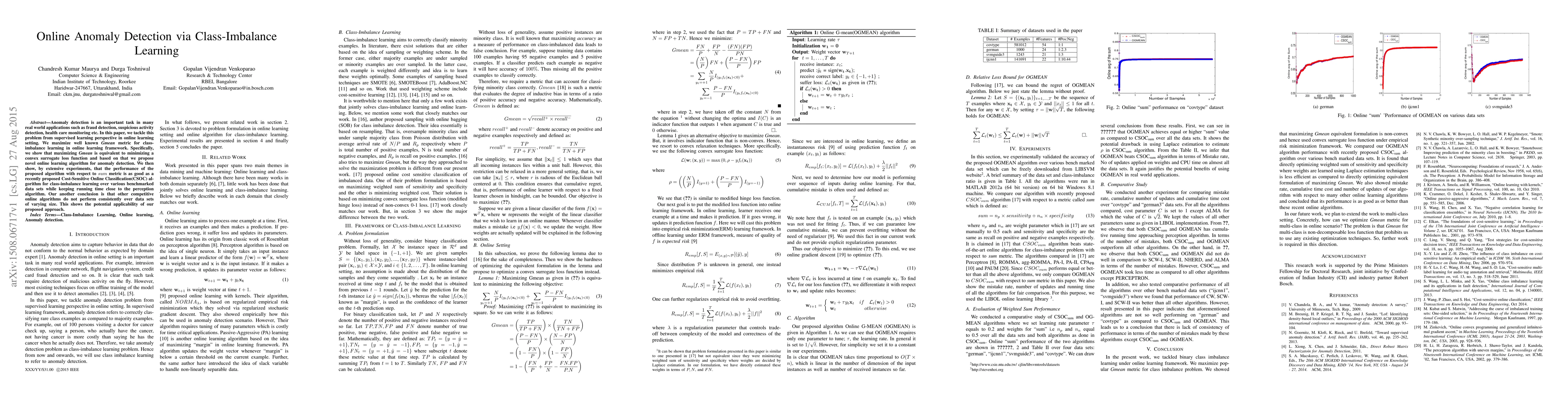 This paper proposes a novel online learning algorithm for anomaly detection that maximizes the Gmean metric for class-imbalance learning. The algorithm's performance is shown to be competitive with existing methods while maintaining efficient running time, demonstrating its potential applicability across various datasets.
