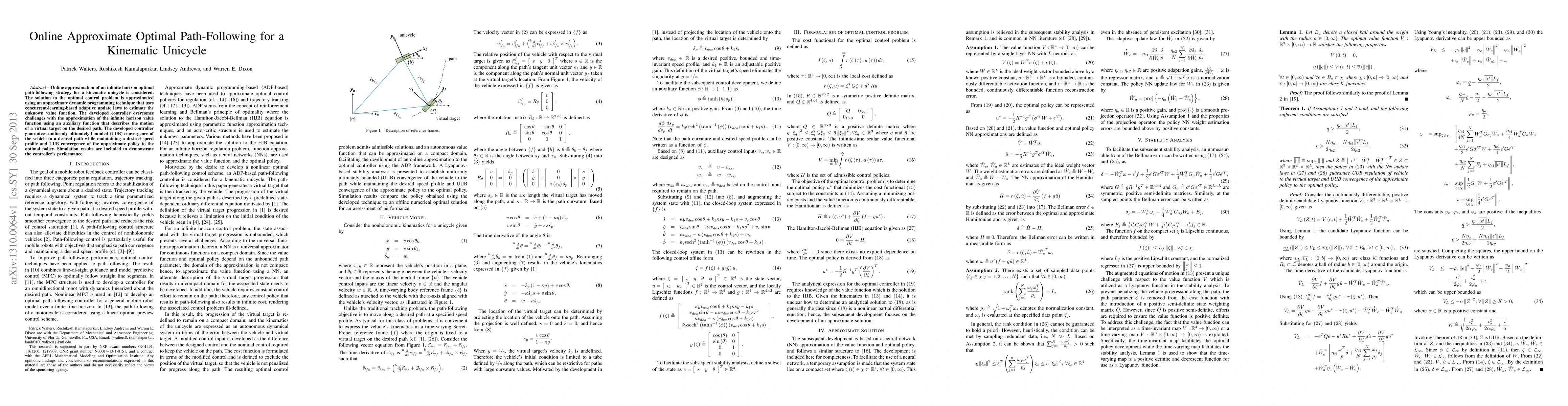 This paper proposes an online approximate optimal control strategy for a kinematic unicycle using dynamic programming and concurrent learning to approximate an infinite horizon value function. The developed controller ensures uniformly ultimately bounded convergence to a desired path and maintains a desired speed profile.