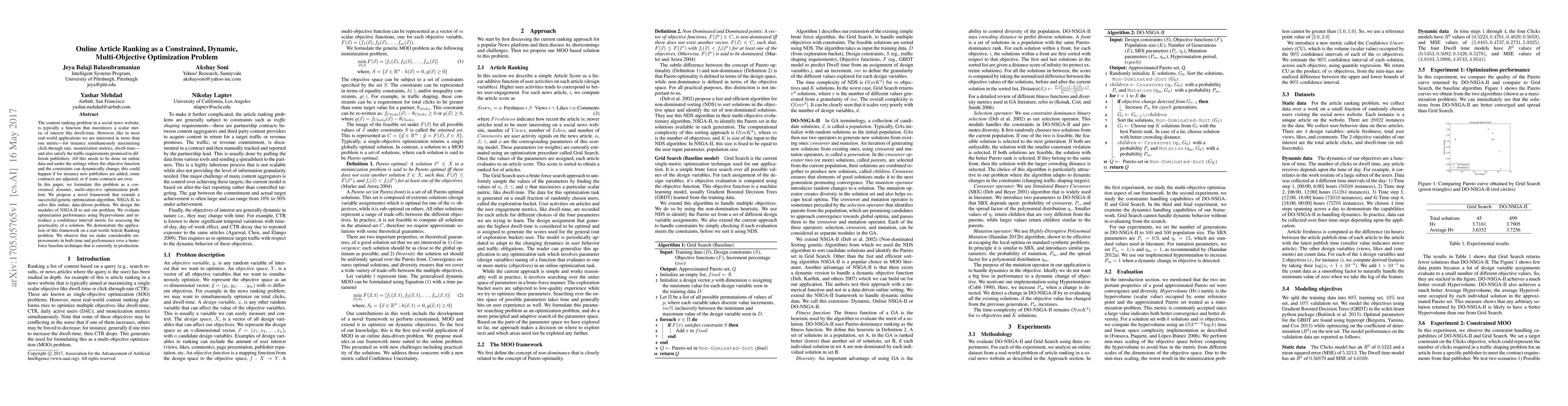 The content ranking problem in a social news website, is typically a function that maximizes a scalar metric of interest like dwell-time. However, like in most real-world applications we are interested in more than one metric---for instance simultaneously maximizing click-through rate, monetization metrics, dwell-time---and also satisfy the traffic requirements promised to different publishers. All this needs to be done on online data and under the settings where the objective function and the constraints can dynamically change; this could happen if for instance new publishers are added, some contracts are adjusted, or if some contracts are over. In this paper, we formulate this problem as a constrained, dynamic, multi-objective optimization problem. We propose a novel framework that extends a successful genetic optimization algorithm, NSGA-II, to solve this online, data-driven problem. We design the modules of NSGA-II to suit our problem. We evaluate optimization performance using Hypervolume and introduce a confidence interval metric for assessing the practicality of a solution. We demonstrate the application of this framework on a real-world Article Ranking problem. We observe that we make considerable improvements in both time and performance over a brute-force baseline technique that is currently in production.