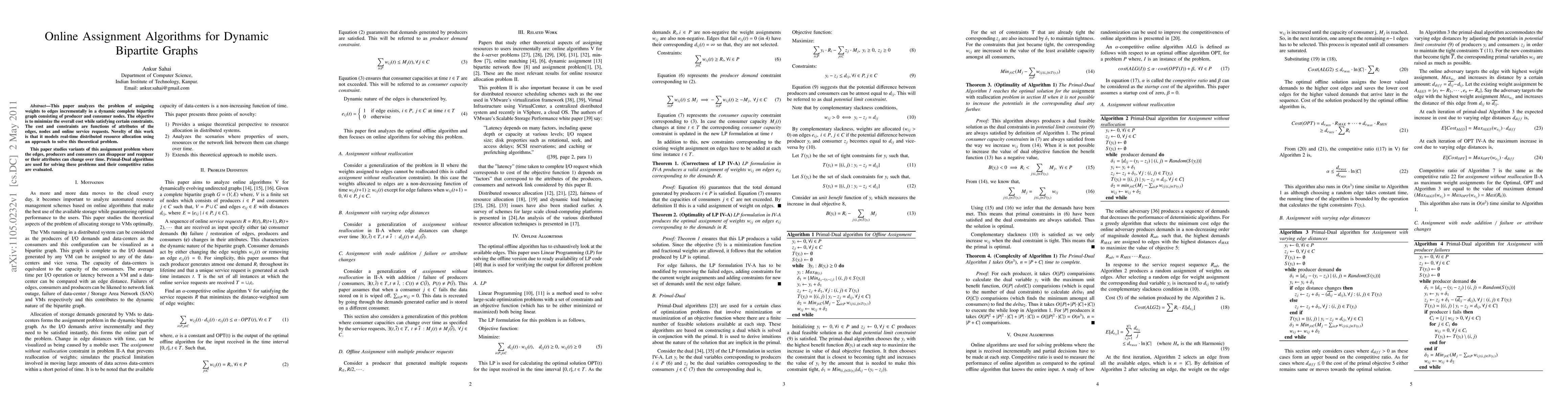 This paper analyzes the problem of assigning weights to edges incrementally in a dynamic complete bipartite graph consisting of producer and consumer nodes. The objective is to minimize the overall cost while satisfying certain constraints. The cost and constraints are functions of attributes of the edges, nodes and online service requests. Novelty of this work is that it models real-time distributed resource allocation using an approach to solve this theoretical problem. This paper studies variants of this assignment problem where the edges, producers and consumers can disappear and reappear or their attributes can change over time. Primal-Dual algorithms are used for solving these problems and their competitive ratios are evaluated.