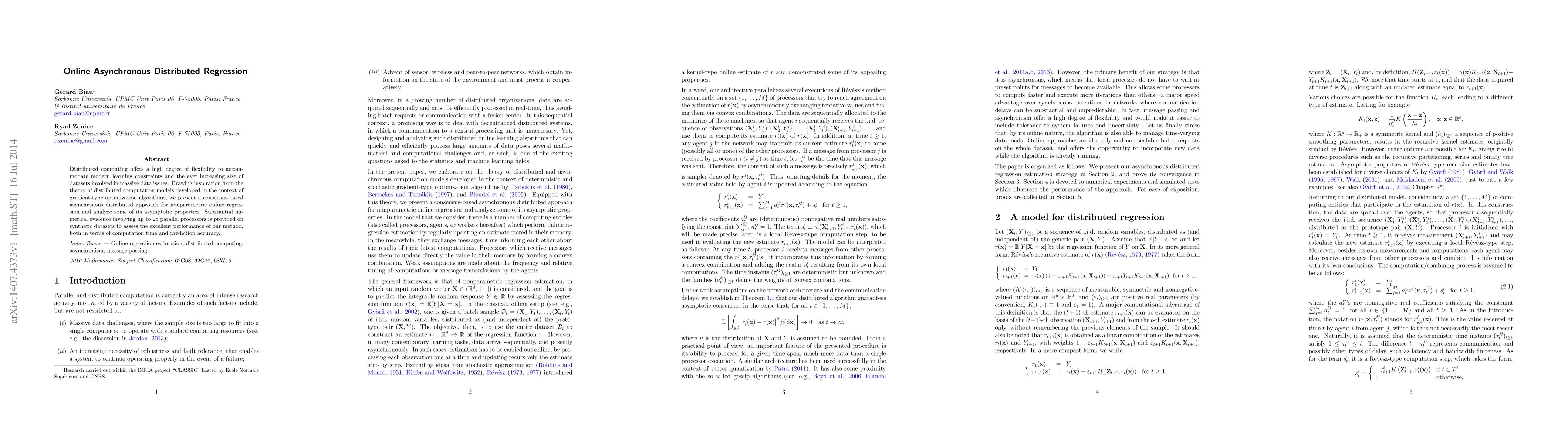 Distributed computing offers a high degree of flexibility to accommodate modern learning constraints and the ever increasing size of datasets involved in massive data issues. Drawing inspiration from the theory of distributed computation models developed in the context of gradient-type optimization algorithms, we present a consensus-based asynchronous distributed approach for nonparametric online regression and analyze some of its asymptotic properties. Substantial numerical evidence involving up to 28 parallel processors is provided on synthetic datasets to assess the excellent performance of our method, both in terms of computation time and prediction accuracy.