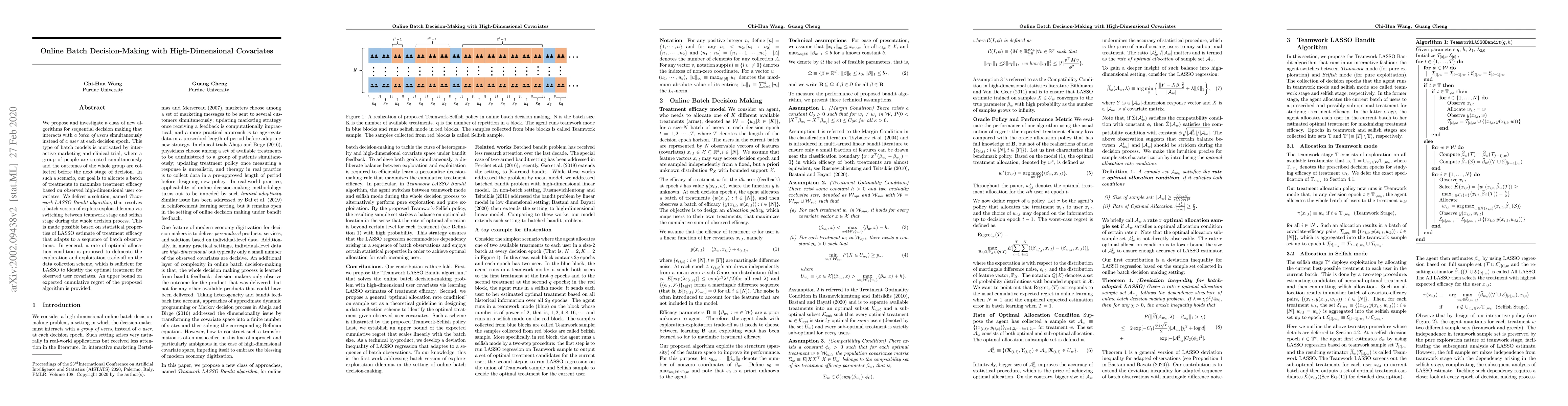 This paper introduces new algorithms for batch decision-making in high-dimensional covariate settings, proposing the Teamwork LASSO Bandit algorithm to maximize treatment efficacy in scenarios like interactive marketing and clinical trials. It provides a framework to balance exploration and exploitation, ensuring optimal allocation and offering an upper bound on cumulative regret.