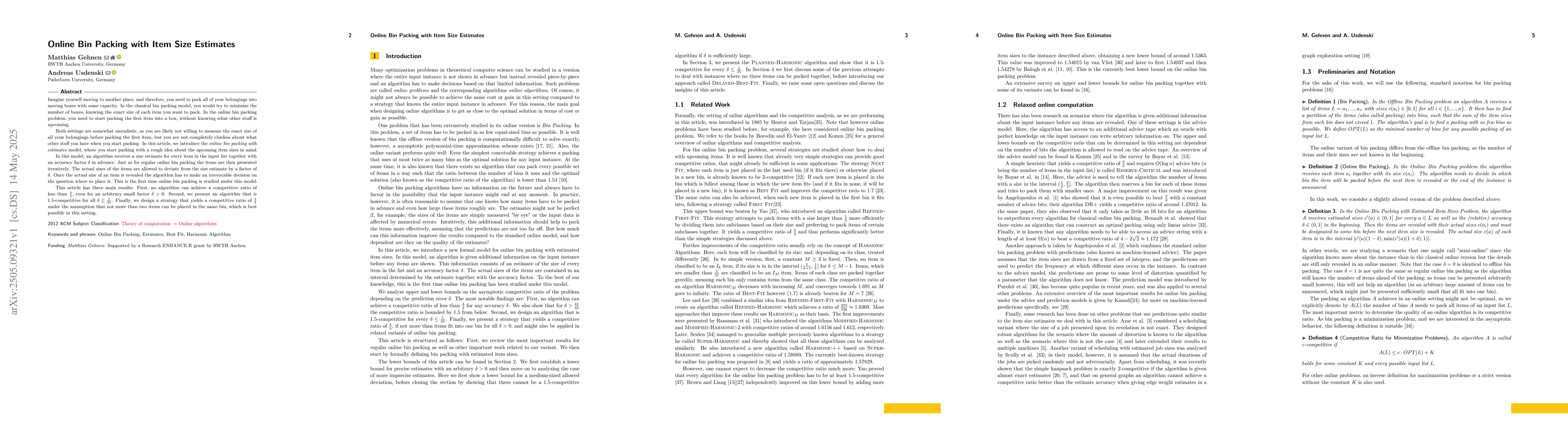 Researchers developed an algorithm for online bin packing with size estimates, finding that no algorithm can achieve a competitive ratio below 4/3, but a 1.5-competitive algorithm exists for small delta values.