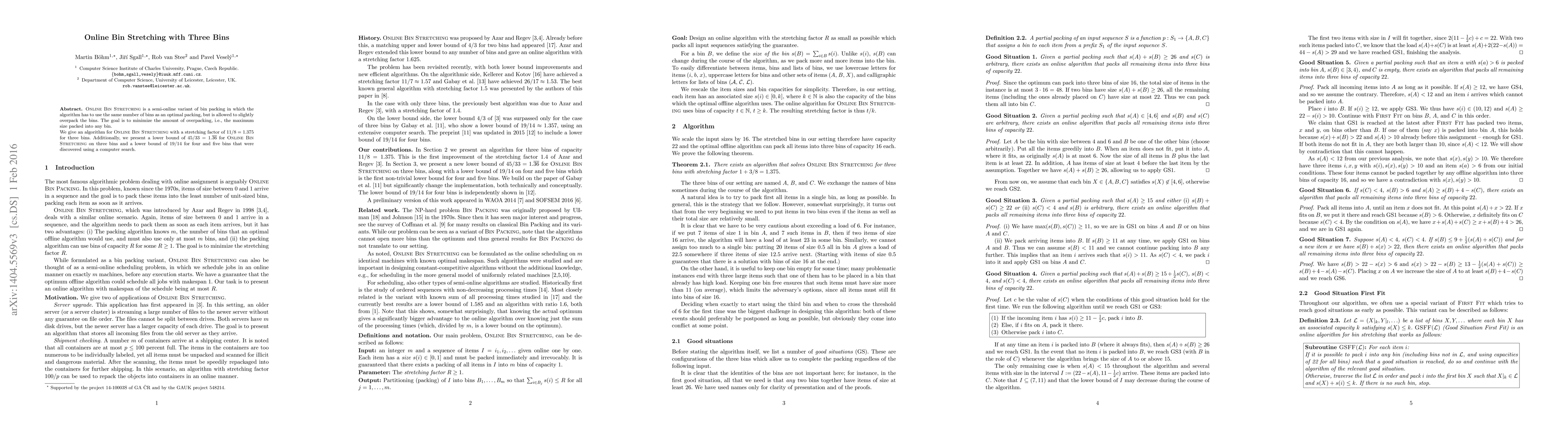 This paper presents an algorithm achieving a stretching factor of 1.375 for Online Bin Stretching with three bins, aiming to minimize overpacking. It also establishes lower bounds for three, four, and five bins, with the best lower bound being 1.36 for three bins.