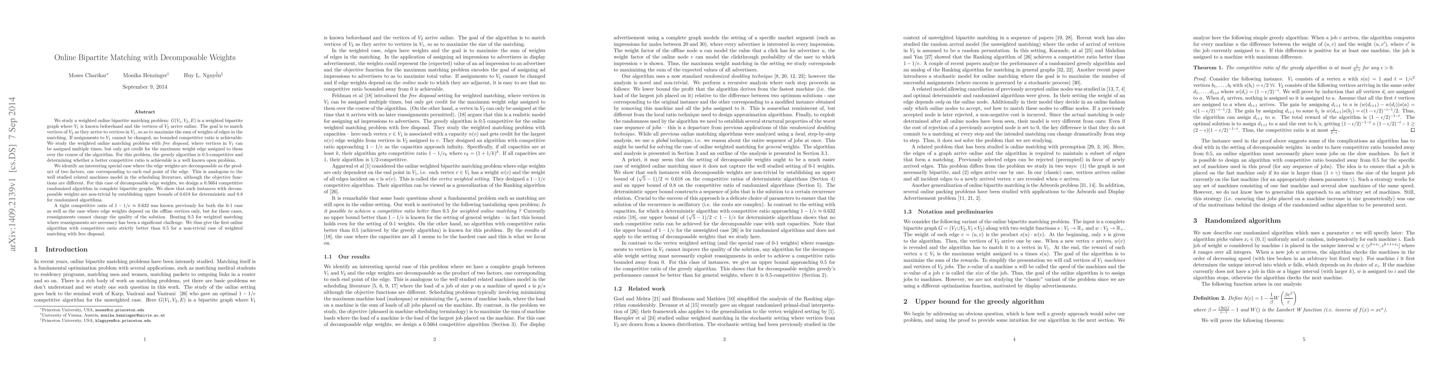 The paper analyzes the online bipartite matching problem with decomposable weights, proposing a 0.5664 competitive randomized algorithm for complete bipartite graphs and establishing bounds for deterministic and randomized algorithms.