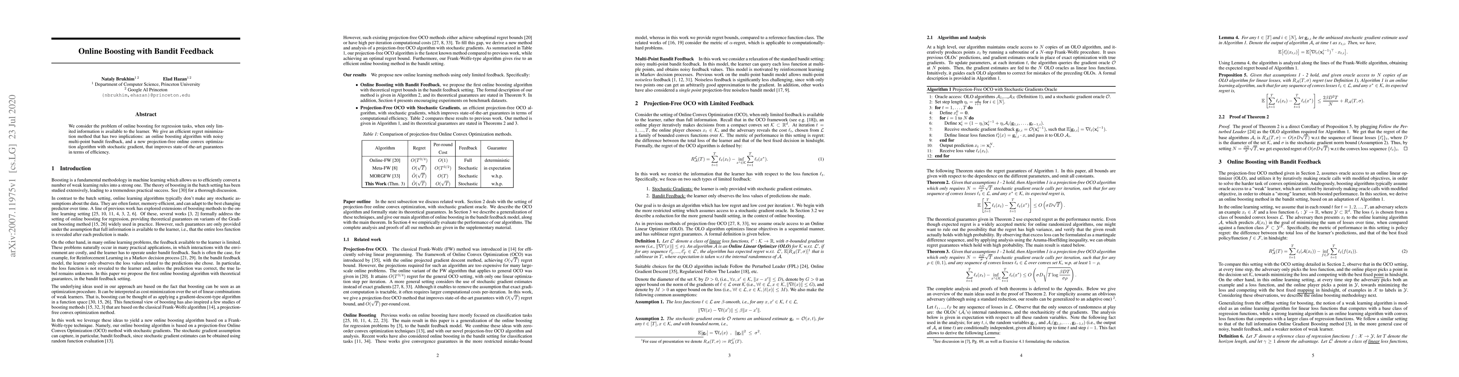 The paper presents an efficient regret minimization method for online boosting in regression tasks with limited learner information, introducing an algorithm for noisy multi-point bandit feedback and a new projection-free online convex optimization algorithm with stochastic gradient, which enhances current efficiency guarantees.