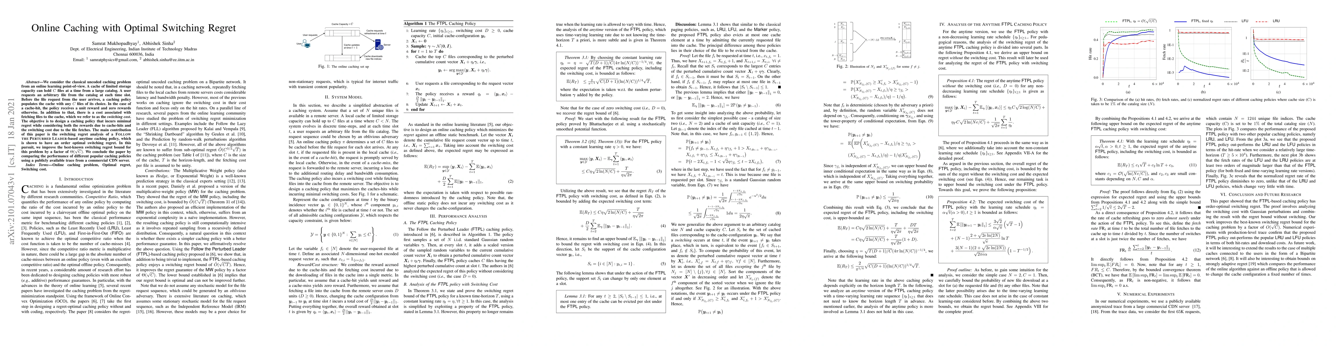 This paper investigates the uncoded caching problem through an online learning lens, focusing on minimizing regret while managing both cache-hit rewards and switching costs. The authors propose an anytime caching policy based on Follow the Perturbed Leader, achieving optimal switching regret and improving existing bounds by a factor of $\Theta(\sqrt{C})$. Performance is evaluated against popular caching strategies using a commercial CDN trace.