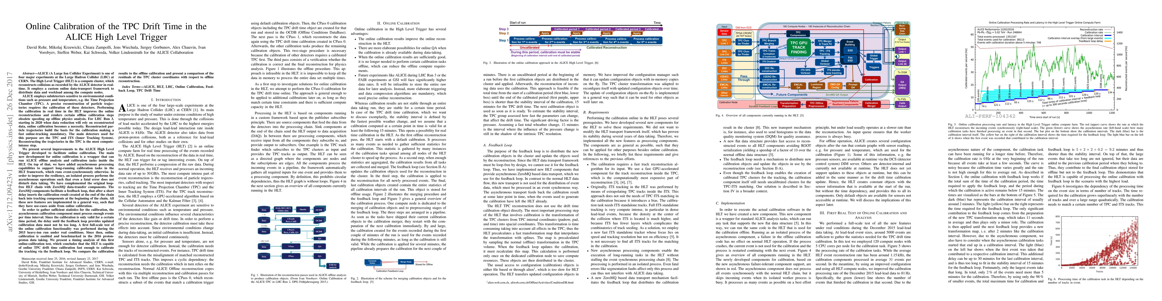 This paper details enhancements to the ALICE High Level Trigger system for real-time calibration of the TPC drift time, crucial for accurate particle trajectory reconstruction. Key developments include a wrapper for running offline analysis tasks within the HLT and asynchronous processing to support extended calibration operations without disrupting event-synchronous data taking.