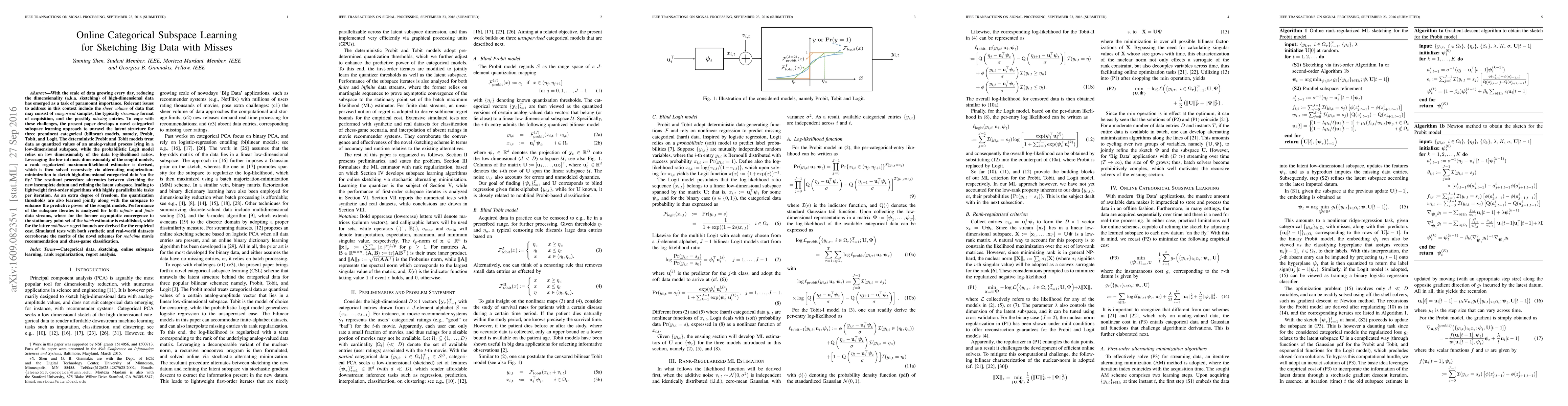 With the scale of data growing every day, reducing the dimensionality (a.k.a. sketching) of high-dimensional data has emerged as a task of paramount importance. Relevant issues to address in this context include the sheer volume of data that may consist of categorical samples, the typically streaming format of acquisition, and the possibly missing entries. To cope with these challenges, the present paper develops a novel categorical subspace learning approach to unravel the latent structure for three prominent categorical (bilinear) models, namely, Probit, Tobit, and Logit. The deterministic Probit and Tobit models treat data as quantized values of an analog-valued process lying in a low-dimensional subspace, while the probabilistic Logit model relies on low dimensionality of the data log-likelihood ratios. Leveraging the low intrinsic dimensionality of the sought models, a rank regularized maximum-likelihood estimator is devised, which is then solved recursively via alternating majorization-minimization to sketch high-dimensional categorical data `on the fly.' The resultant procedure alternates between sketching the new incomplete datum and refining the latent subspace, leading to lightweight first-order algorithms with highly parallelizable tasks per iteration. As an extra degree of freedom, the quantization thresholds are also learned jointly along with the subspace to enhance the predictive power of the sought models. Performance of the subspace iterates is analyzed for both infinite and finite data streams, where for the former asymptotic convergence to the stationary point set of the batch estimator is established, while for the latter sublinear regret bounds are derived for the empirical cost. Simulated tests with both synthetic and real-world datasets corroborate the merits of the novel schemes for real-time movie recommendation and chess-game classification.