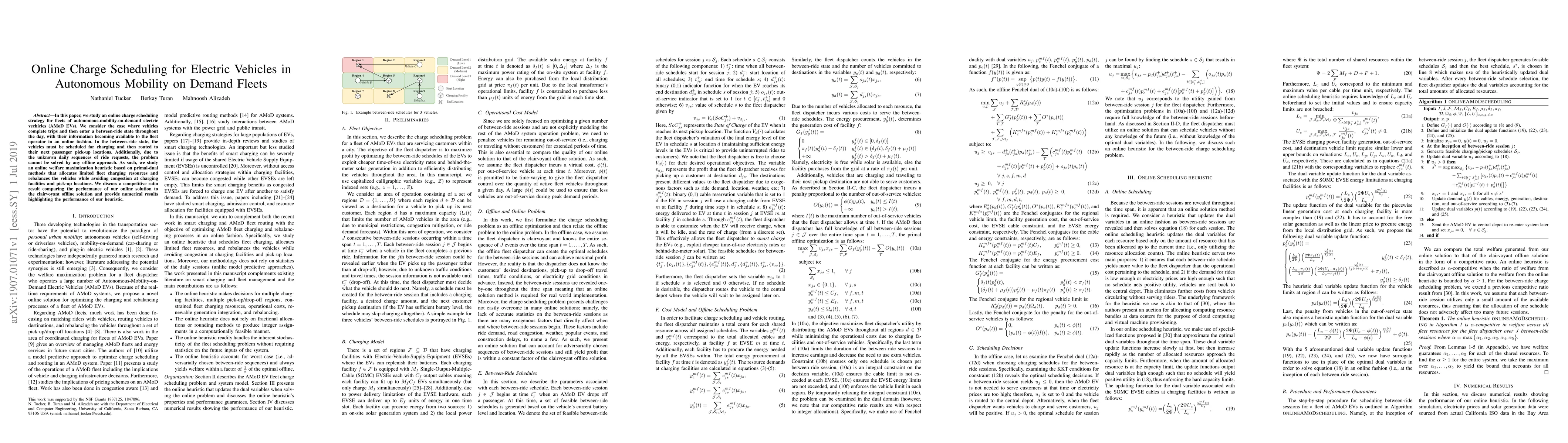 This paper proposes an online charge scheduling strategy for autonomous electric vehicles in mobility-on-demand fleets, focusing on allocating limited charging resources while maximizing fleet welfare. The strategy employs a primal-dual heuristic to address the dynamic nature of ride requests and avoid congestion, with results showing its competitive performance compared to an ideal offline solution.
