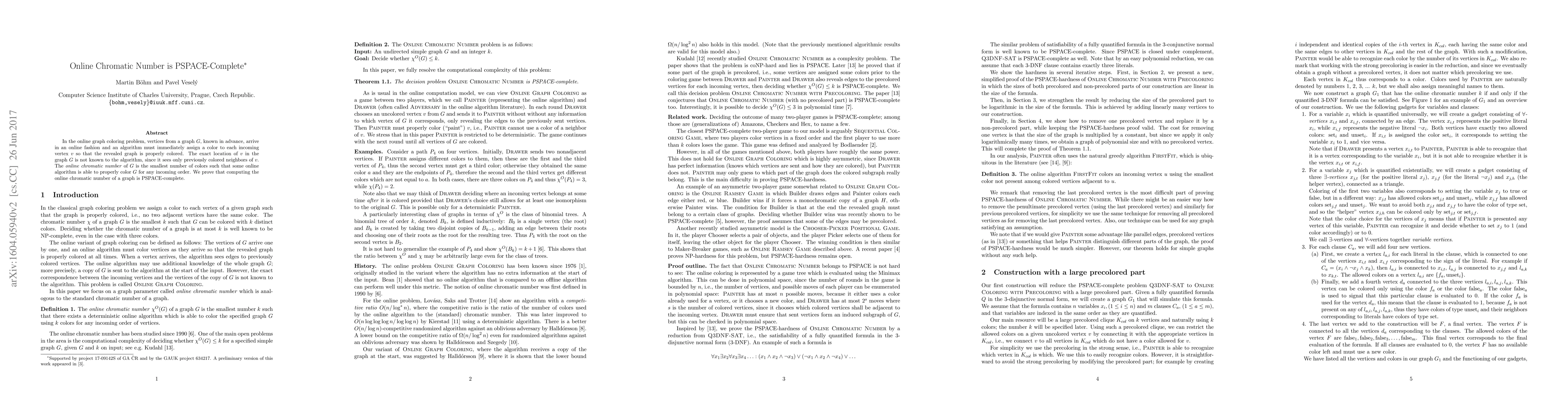 The online graph coloring problem requires assigning colors to vertices arriving sequentially without prior knowledge of their positions. The paper proves that determining the online chromatic number, the minimum colors required for any incoming order, is PSPACE-complete.