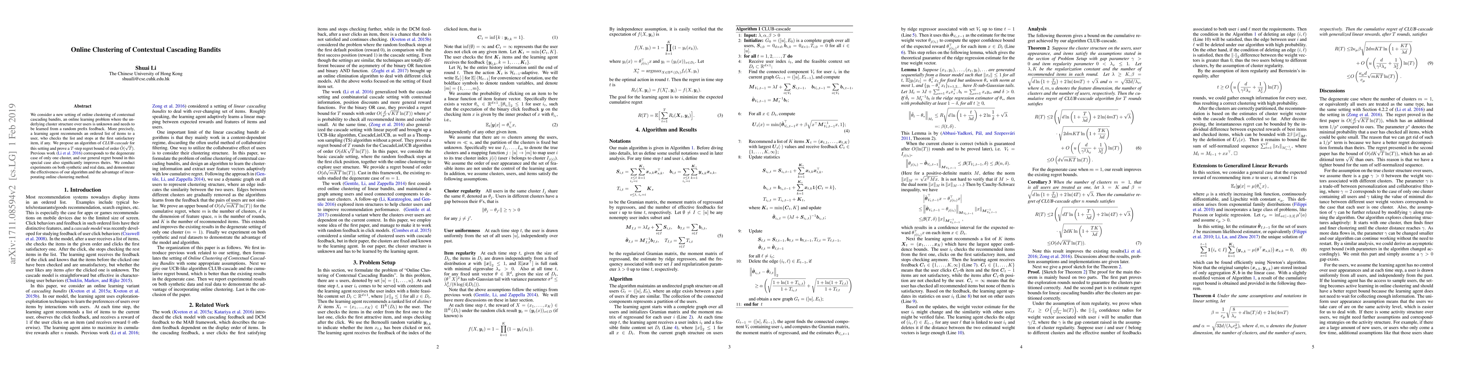 Researchers propose an algorithm for online clustering of contextual cascading bandits, achieving a $T$-step regret bound of $ ilde{O}( ext{sqrt}(T))$, improving upon previous work in the degenerate case.