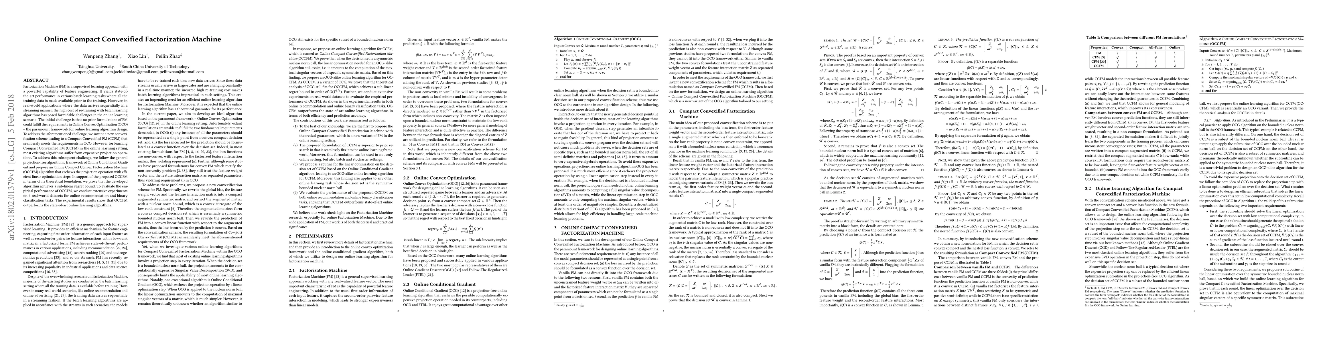 The paper proposes an Online Compact Convex Factorization Machine (OCCFM) algorithm to address the challenges of applying Factorization Machines in online learning scenarios. The OCCFM algorithm efficiently avoids expensive projection operations by leveraging a projection-free approach, achieving a sub-linear regret bound and outperforming existing online learning algorithms in real-world datasets.