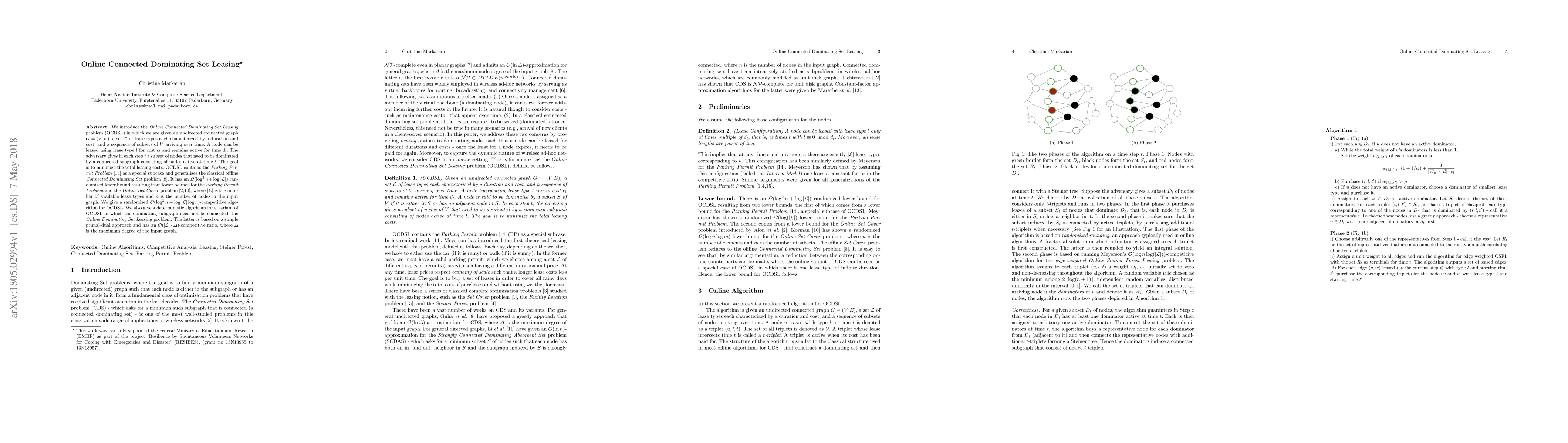 The paper introduces the Online Connected Dominating Set Leasing problem (OCDSL), where the goal is to minimize leasing costs to dominate subsets of nodes in an evolving graph using connected subgraphs. It presents a randomized algorithm achieving $\mathcal{O}(\log ^2 n + \log |\mathcal{L}| \log n)$ competitive ratio, and a deterministic algorithm for a variant with a $\mathcal{O}(|\mathcal{L}| \cdot \Delta)$ competitive ratio.