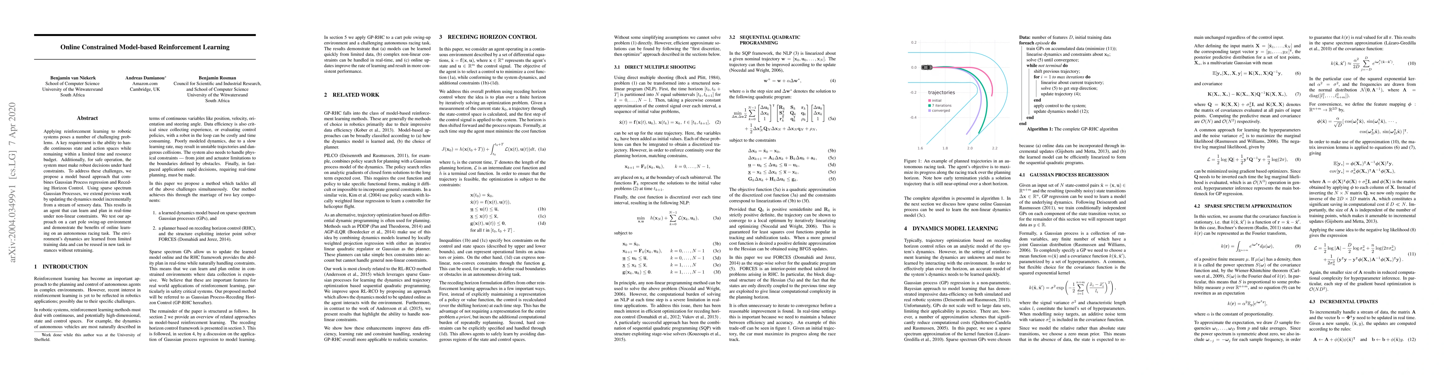 Applying reinforcement learning to robotic systems poses a number of challenging problems. A key requirement is the ability to handle continuous state and action spaces while remaining within a limited time and resource budget. Additionally, for safe operation, the system must make robust decisions under hard constraints. To address these challenges, we propose a model based approach that combines Gaussian Process regression and Receding Horizon Control. Using sparse spectrum Gaussian Processes, we extend previous work by updating the dynamics model incrementally from a stream of sensory data. This results in an agent that can learn and plan in real-time under non-linear constraints. We test our approach on a cart pole swing-up environment and demonstrate the benefits of online learning on an autonomous racing task. The environment's dynamics are learned from limited training data and can be reused in new task instances without retraining.