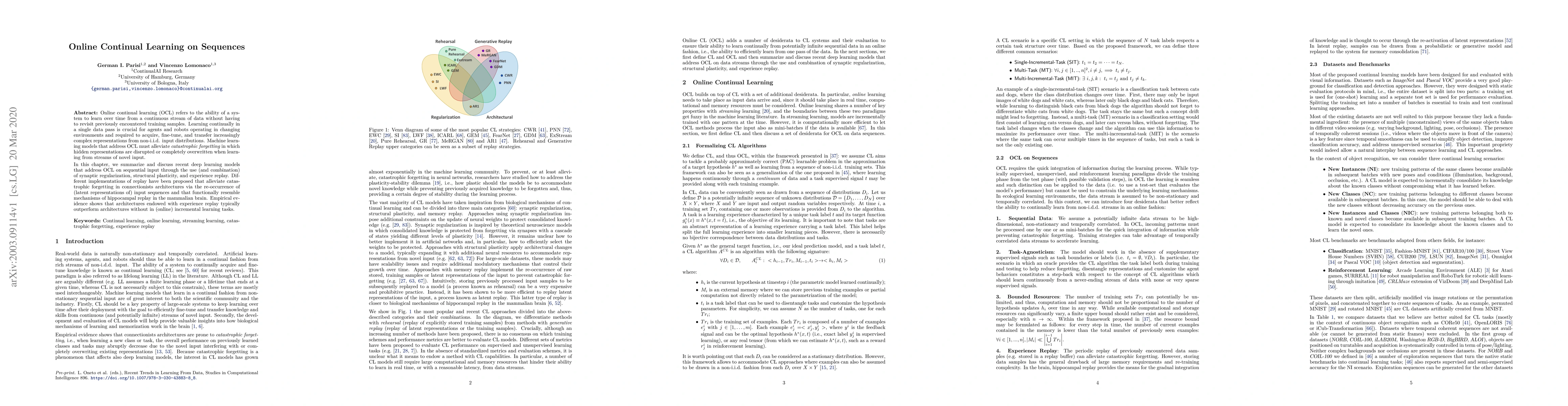 Online continual learning (OCL) refers to the ability of a system to learn over time from a continuous stream of data without having to revisit previously encountered training samples. Learning continually in a single data pass is crucial for agents and robots operating in changing environments and required to acquire, fine-tune, and transfer increasingly complex representations from non-i.i.d. input distributions. Machine learning models that address OCL must alleviate \textit{catastrophic forgetting} in which hidden representations are disrupted or completely overwritten when learning from streams of novel input. In this chapter, we summarize and discuss recent deep learning models that address OCL on sequential input through the use (and combination) of synaptic regularization, structural plasticity, and experience replay. Different implementations of replay have been proposed that alleviate catastrophic forgetting in connectionists architectures via the re-occurrence of (latent representations of) input sequences and that functionally resemble mechanisms of hippocampal replay in the mammalian brain. Empirical evidence shows that architectures endowed with experience replay typically outperform architectures without in (online) incremental learning tasks.