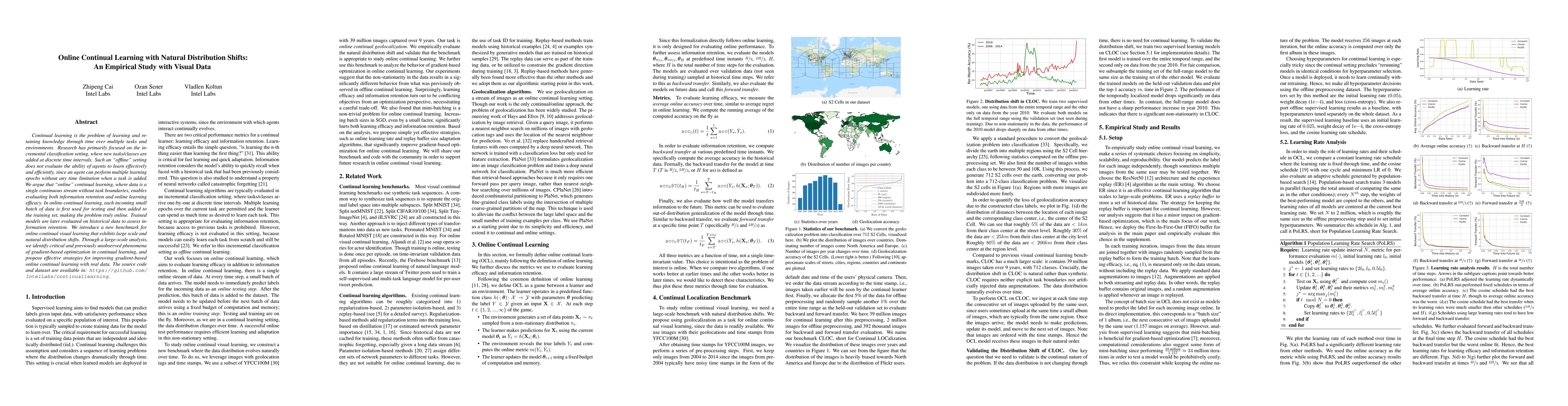 Continual learning is the problem of learning and retaining knowledge through time over multiple tasks and environments. Research has primarily focused on the incremental classification setting, where new tasks/classes are added at discrete time intervals. Such an "offline" setting does not evaluate the ability of agents to learn effectively and efficiently, since an agent can perform multiple learning epochs without any time limitation when a task is added. We argue that "online" continual learning, where data is a single continuous stream without task boundaries, enables evaluating both information retention and online learning efficacy. In online continual learning, each incoming small batch of data is first used for testing and then added to the training set, making the problem truly online. Trained models are later evaluated on historical data to assess information retention. We introduce a new benchmark for online continual visual learning that exhibits large scale and natural distribution shifts. Through a large-scale analysis, we identify critical and previously unobserved phenomena of gradient-based optimization in continual learning, and propose effective strategies for improving gradient-based online continual learning with real data. The source code and dataset are available in: https://github.com/IntelLabs/continuallearning.
