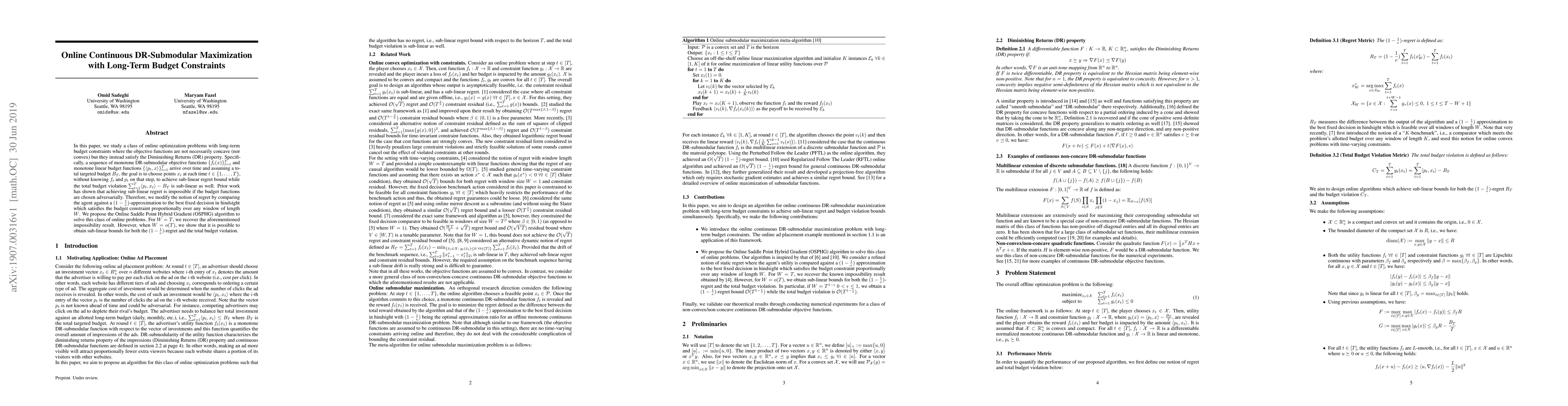This paper explores online optimization problems with long-term budget constraints where objective functions exhibit diminishing returns. It proposes the Online Saddle Point Hybrid Gradient (OSPHG) algorithm to achieve sub-linear regret and budget violation bounds, modifying regret to compare against a $(1-\frac{1}{e})$-approximation of the best fixed decision.