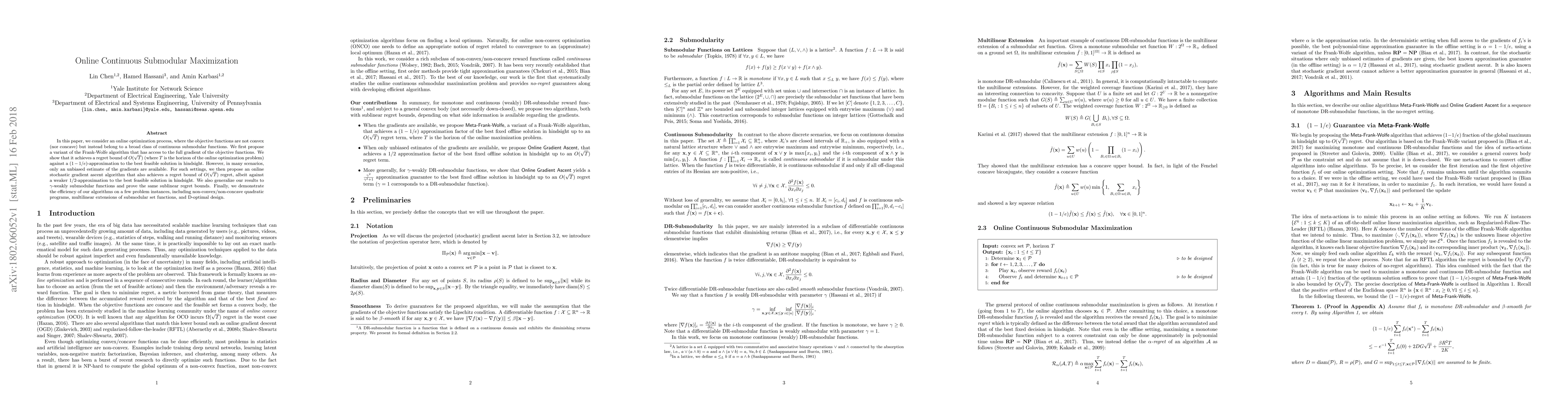 This paper proposes algorithms for online optimization with continuous submodular functions, achieving $O(\sqrt{T})$ regret bounds. It introduces a gradient-based Frank-Wolfe variant and a stochastic gradient ascent method, both applicable to weakly submodular functions, and demonstrates their effectiveness on various non-convex problems.