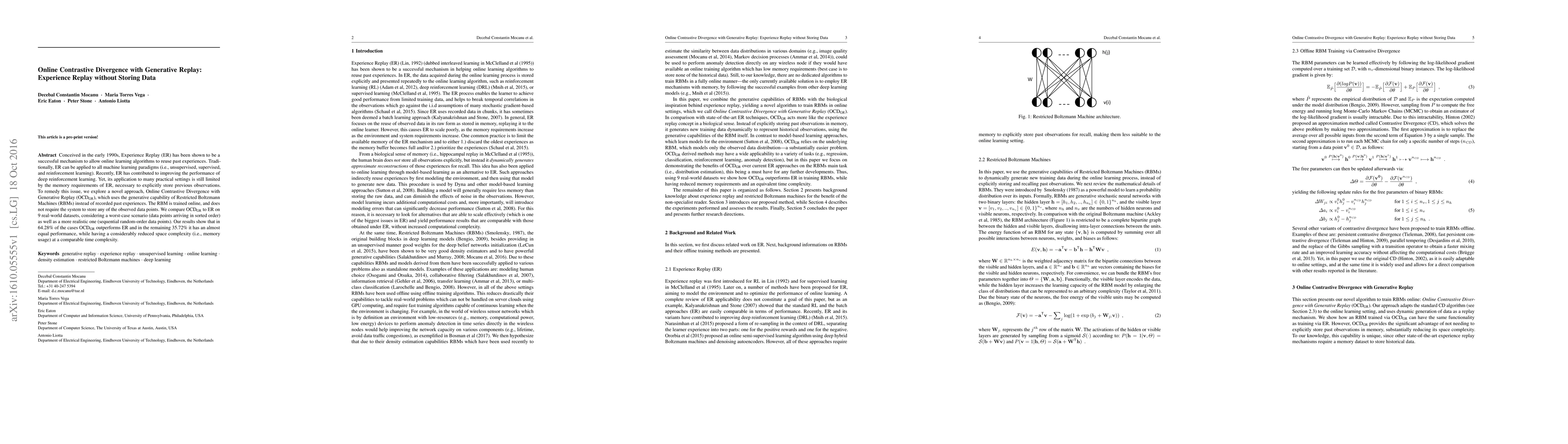 Conceived in the early 1990s, Experience Replay (ER) has been shown to be a successful mechanism to allow online learning algorithms to reuse past experiences. Traditionally, ER can be applied to all machine learning paradigms (i.e., unsupervised, supervised, and reinforcement learning). Recently, ER has contributed to improving the performance of deep reinforcement learning. Yet, its application to many practical settings is still limited by the memory requirements of ER, necessary to explicitly store previous observations. To remedy this issue, we explore a novel approach, Online Contrastive Divergence with Generative Replay (OCD_GR), which uses the generative capability of Restricted Boltzmann Machines (RBMs) instead of recorded past experiences. The RBM is trained online, and does not require the system to store any of the observed data points. We compare OCD_GR to ER on 9 real-world datasets, considering a worst-case scenario (data points arriving in sorted order) as well as a more realistic one (sequential random-order data points). Our results show that in 64.28% of the cases OCD_GR outperforms ER and in the remaining 35.72% it has an almost equal performance, while having a considerably reduced space complexity (i.e., memory usage) at a comparable time complexity.