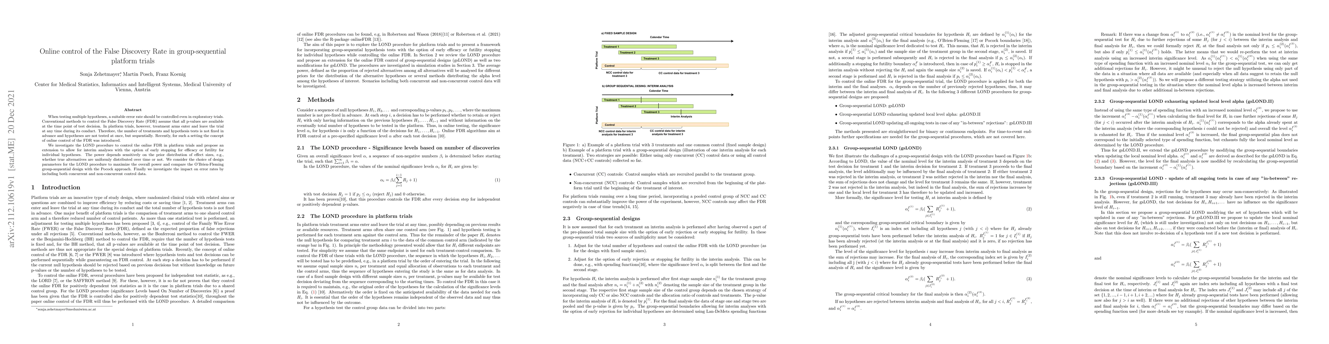 This paper investigates the LOND procedure for controlling the online False Discovery Rate (FDR) in platform trials, where hypotheses are tested sequentially. It proposes an extension allowing interim analyses and early stopping, and compares design parameters to maximize power, considering the impact of different control data types.