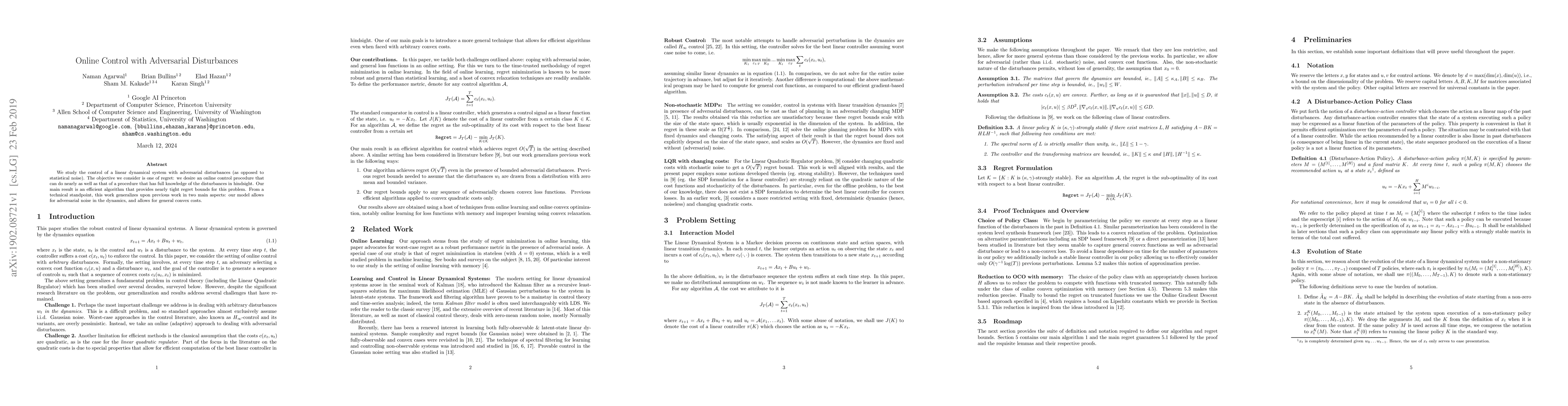 This paper proposes an efficient online control algorithm for linear dynamical systems with adversarial disturbances, aiming to minimize regret compared to a fully informed hindsight procedure. The algorithm achieves nearly tight regret bounds, extending previous work by accommodating adversarial noise in dynamics and general convex costs.