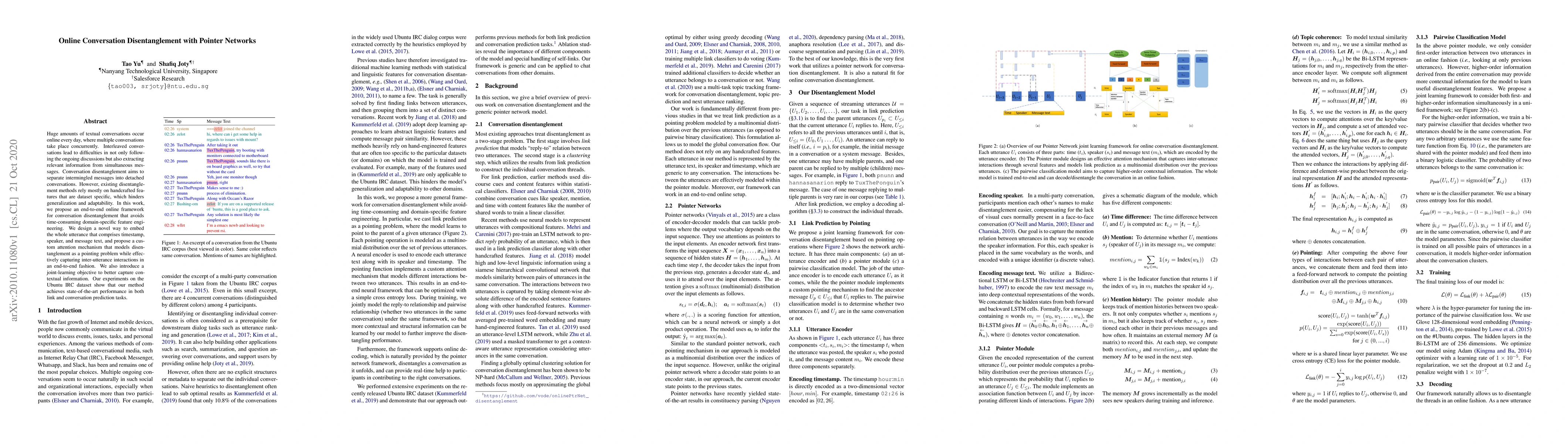 This paper proposes an end-to-end online framework for disentanglement of interleaved online conversations using pointer networks and custom attention mechanisms, achieving state-of-the-art performance on the Ubuntu IRC dataset without relying on dataset-specific handcrafted features.