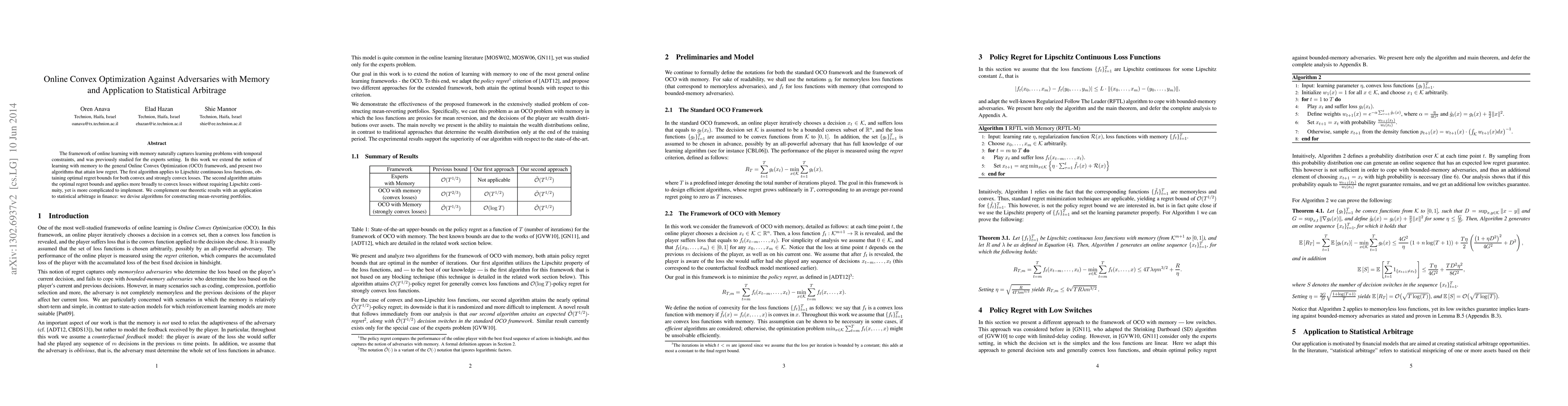 This paper extends the concept of learning with memory to Online Convex Optimization (OCO), presenting two algorithms achieving low regret. The first algorithm optimally handles Lipschitz continuous loss functions, while the second, though more complex, applies broadly to convex losses without Lipschitz continuity. An application to statistical arbitrage in finance is demonstrated through mean-reverting portfolio construction.