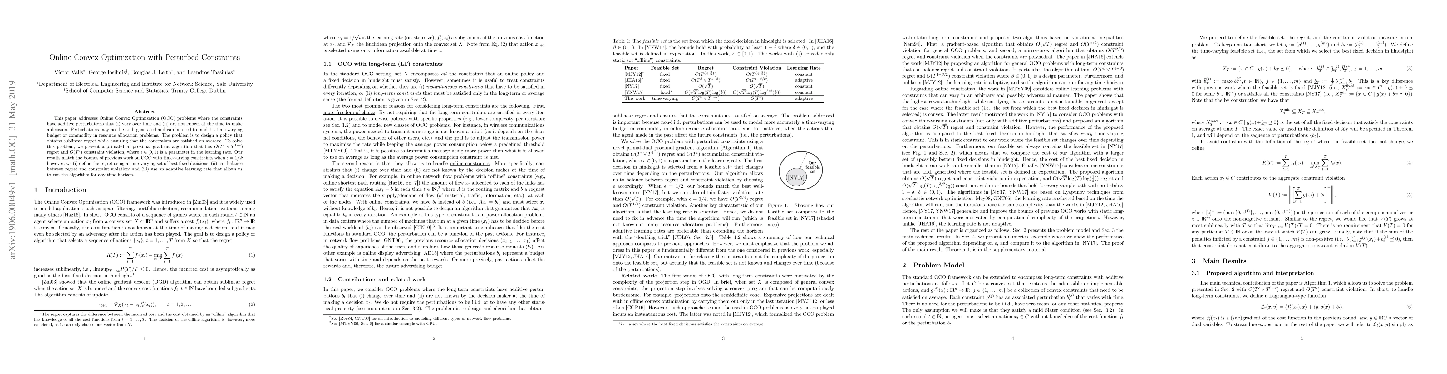 This paper addresses Online Convex Optimization (OCO) problems where the constraints have additive perturbations that (i) vary over time and (ii) are not known at the time to make a decision. Perturbations may not be i.i.d. generated and can be used to model a time-varying budget or commodity in resource allocation problems. The problem is to design a policy that obtains sublinear regret while ensuring that the constraints are satisfied on average. To solve this problem, we present a primal-dual proximal gradient algorithm that has $O(T^\epsilon \vee T^{1-\epsilon})$ regret and $O(T^\epsilon)$ constraint violation, where $\epsilon \in [0,1)$ is a parameter in the learning rate. Our results match the bounds of previous work on OCO with time-varying constraints when $\epsilon = 1/2$; however, we (i) define the regret using a time-varying set of best fixed decisions; (ii) can balance between regret and constraint violation; and (iii) use an adaptive learning rate that allows us to run the algorithm for any time horizon.