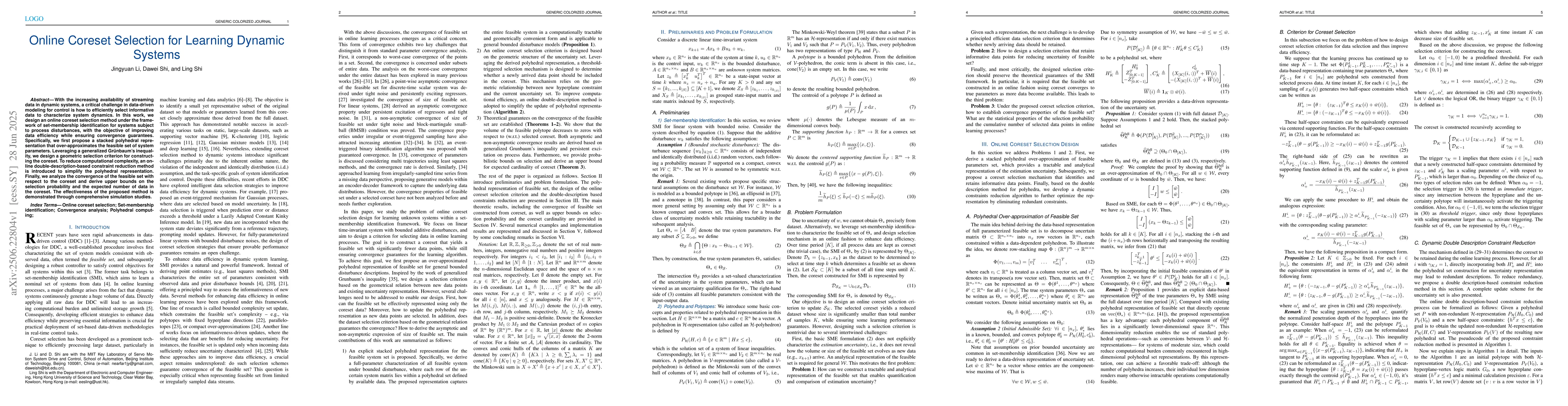 With the increasing availability of streaming data in dynamic systems, a critical challenge in data-driven modeling for control is how to efficiently select informative data to characterize system dynamics. In this work, we design an online coreset selection method under the framework of set-membership identification for systems subject to process disturbances, with the objective of improving data efficiency while ensuring convergence guarantees. Specifically, we first propose a stacked polyhedral representation that over-approximates the feasible set of system parameters. Leveraging a generalized Gr\"unbaum's inequality, we design a geometric selection criterion for constructing the coreset. To reduce computational complexity, an online double-description-based constraint reduction method is introduced to simplify the polyhedral representation. Finally, we analyze the convergence of the feasible set with respect to the coreset and derive upper bounds on the selection probability and the expected number of data in the coreset. The effectiveness of the proposed method is demonstrated through comprehensive simulation studies.