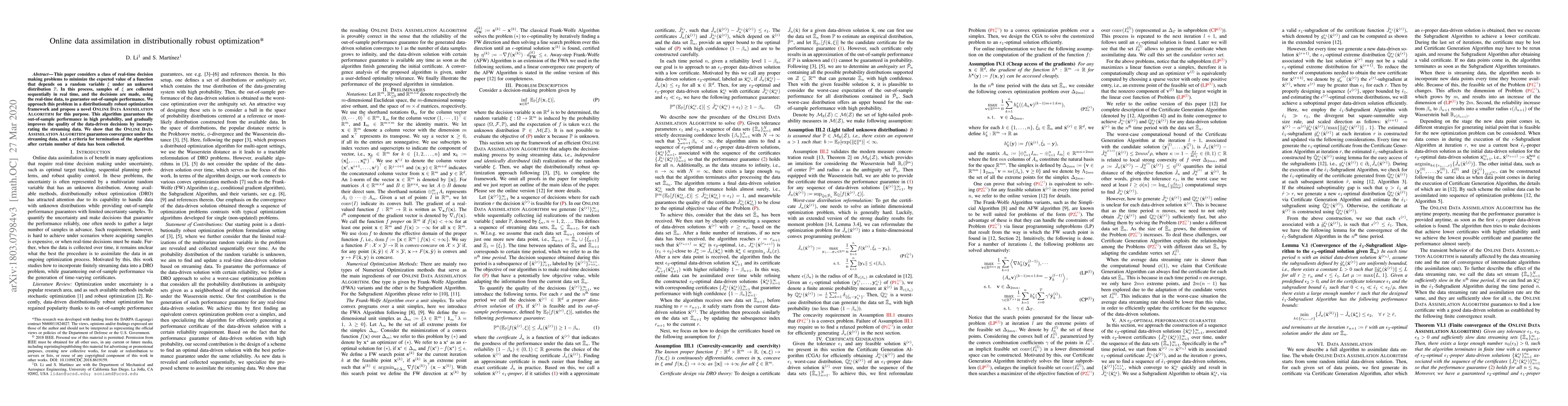 This paper considers a class of real-time decision making problems to minimize the expected value of a function that depends on a random variable $\xi$ under an unknown distribution $\mathbb{P}$. In this process, samples of $\xi$ are collected sequentially in real time, and the decisions are made, using the real-time data, to guarantee out-of-sample performance. We approach this problem in a distributionally robust optimization framework and propose a novel Online Data Assimilation Algorithm for this purpose. This algorithm guarantees the out-of-sample performance in high probability, and gradually improves the quality of the data-driven decisions by incorporating the streaming data. We show that the Online Data Assimilation Algorithm guarantees convergence under the streaming data, and a criteria for termination of the algorithm after certain number of data has been collected.